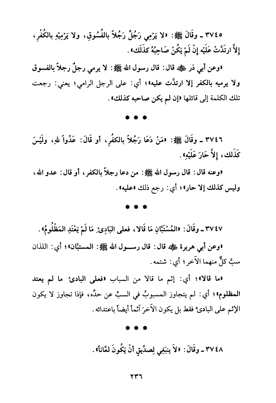 3745 - وقَالَ - صلى الله عليه وسلم -: "لا يَرْمِي رَجُل رَجُلاً بالفُسُوقِ، ولا يَرْمِيْهِ بالكُفْرِ، إِلاَّ ارتَدَّتْ عَلَيْه إنْ لَمْ يَكُنْ صَاحِبُهُ كذَلَك".