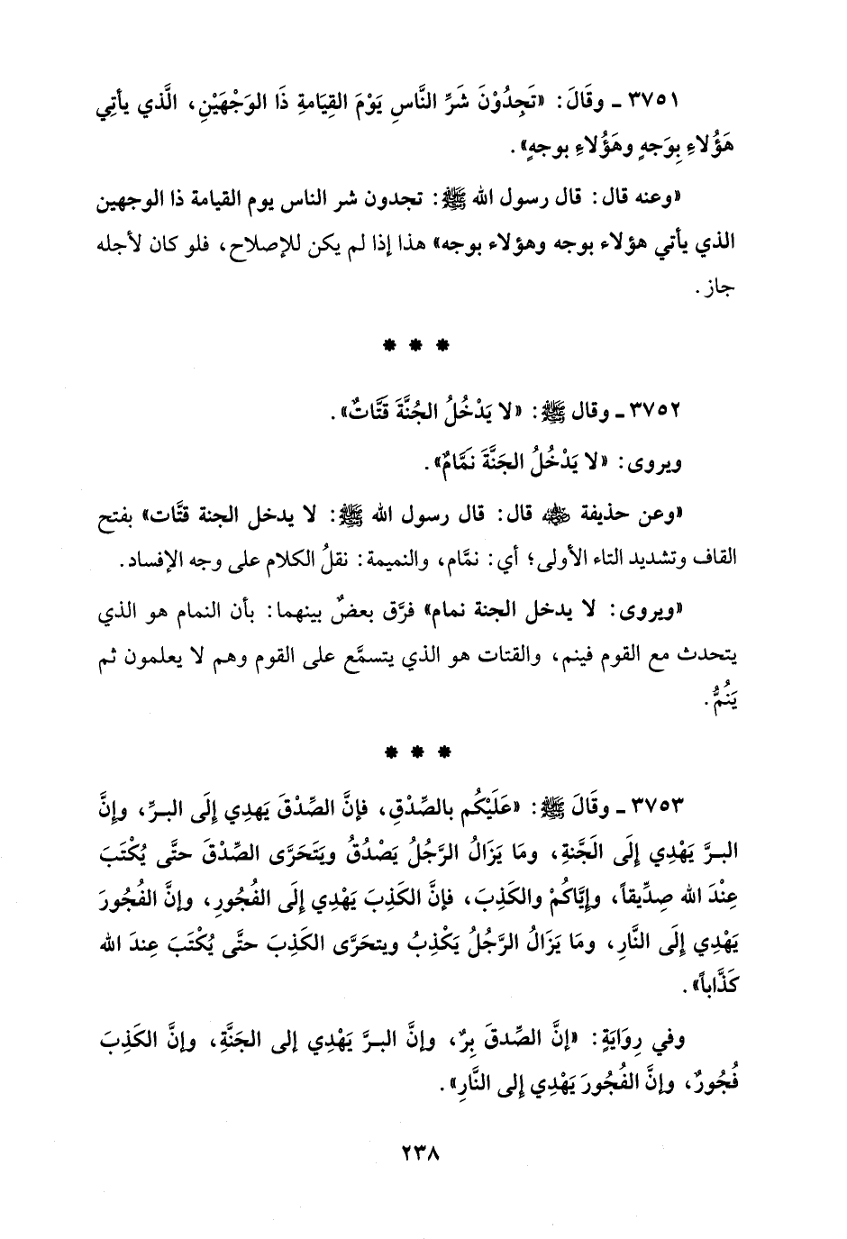 3751 - وقَالَ: "تَجدُوْنَ شَرِّ النَّاسِ يَوْمَ القِيَامةِ ذَا الوَجْهيْنِ، الَّذي يأتِي هؤُلاءِ بِوَجهٍ وهؤلاء بوجهٍ".