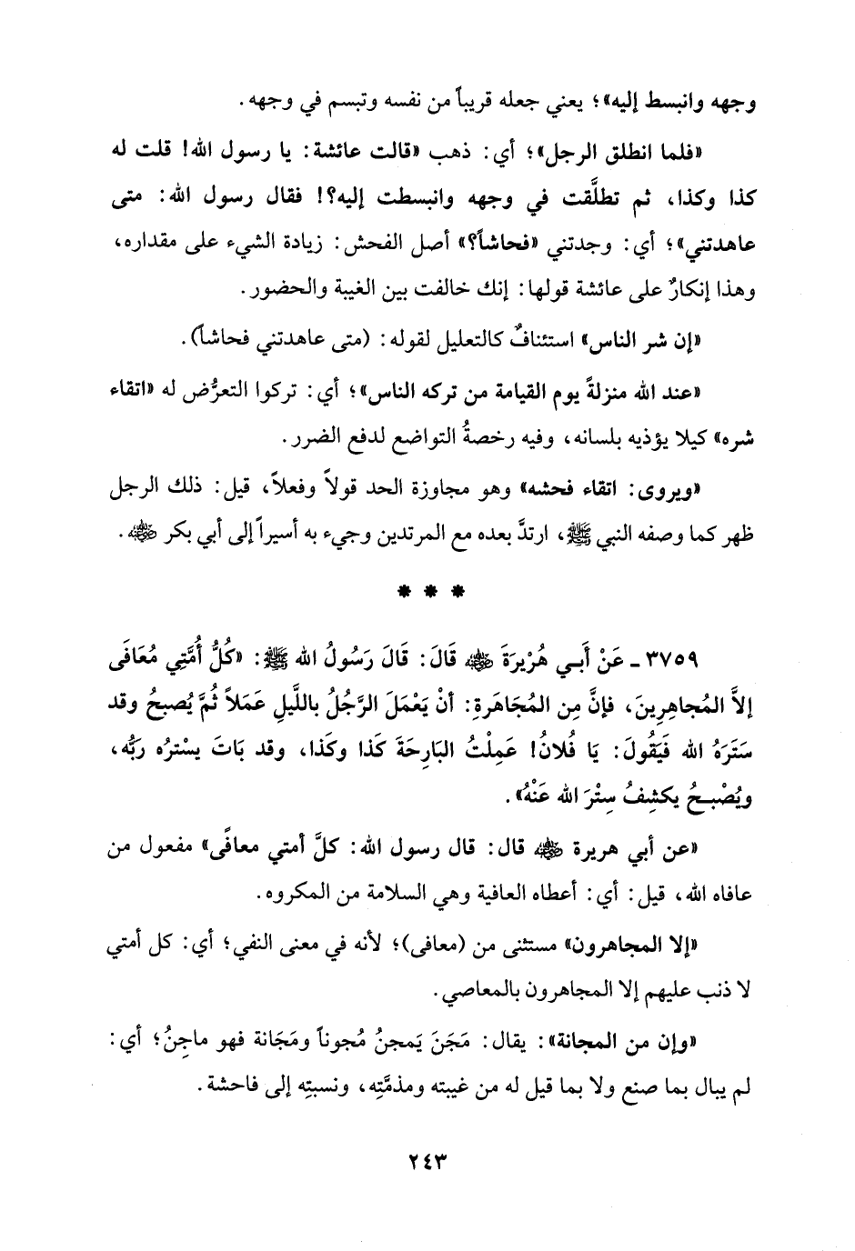 3759 - عَنْ أَبي هُريرَة - رضي الله عنه - قَالَ: قَالَ رَسُولُ الله - صلى الله عليه وسلم - "كُلُّ أُمَّتِي مُعَافَى إلَّا المُجاهِرِينَ، فإنَّ مِن المُجَاهرةِ: أنْ يَعمَلَ الرَّجُلُ باللَّيلِ عَمَلاً ثُمَّ يُصبحُ وقد سَتَرَهُ الله فَيقولَ: يَا فُلانُ! عَمِلْتُ البَارِحَةَ كذا وكذا، وقد بَاتَ يسْترُه ربُّه، ويُصْبحُ يكشِفُ سِتْرَ الله عَنْهُ".