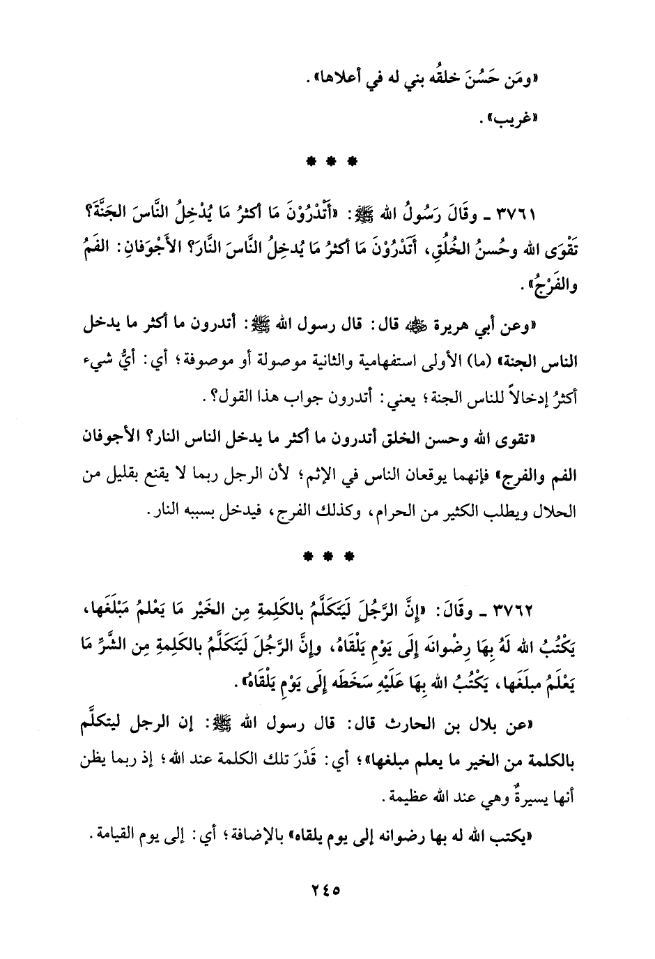 3761 - وقَالَ رَسُولُ الله - صلى الله عليه وسلم -: "أتدرُوْنَ مَا أكثرُ مَا يُدخِلُ النَّاسَ الجَنَّة؟ تَقْوَى الله وحُسنُ الخُلُقِ، أترُوْنَ مَا أكثرُ مَا يُدخِلُ الناسَ النَّار؟ الأَجْوَفانِ: الفَمُ والفَرجُ".