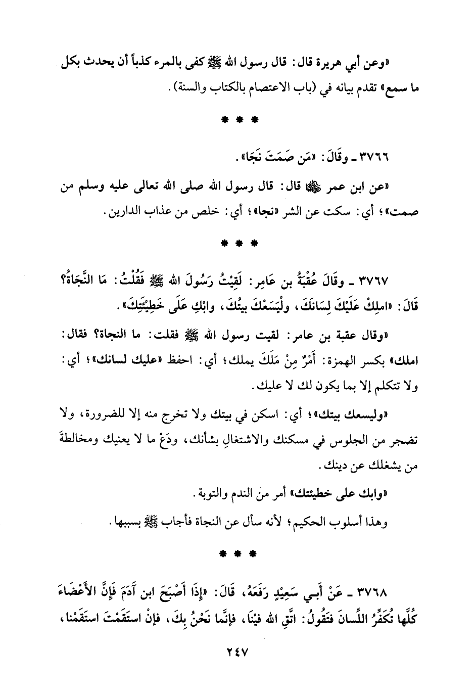 3767 - وقَالَ عُقْبةُ بن عَامِر: لَقِيْتُ رَسُولَ الله - صلى الله عليه وسلم - فَقُلْتُ: مَا النَّجَاةُ؟ قَالَ: "املِكْ عَلَيْكَ لِسَانَكَ، ولْيَسَعكَ بيتُكَ، وابْكِ عَلَى خَطِيْئَتِكَ".