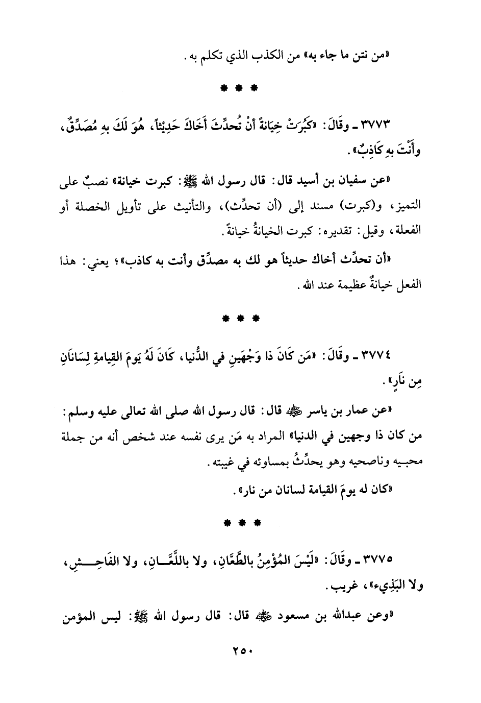 3773 - وقَالَ: "كبُرَتْ خِيَانةً أنْ تُحدِّثَ أَخَاكَ حَدِيْثاً، هُوَ لَكَ بهِ مُصَدِّقٌ، وأَنْتَ بهِ كَاذبٌ".