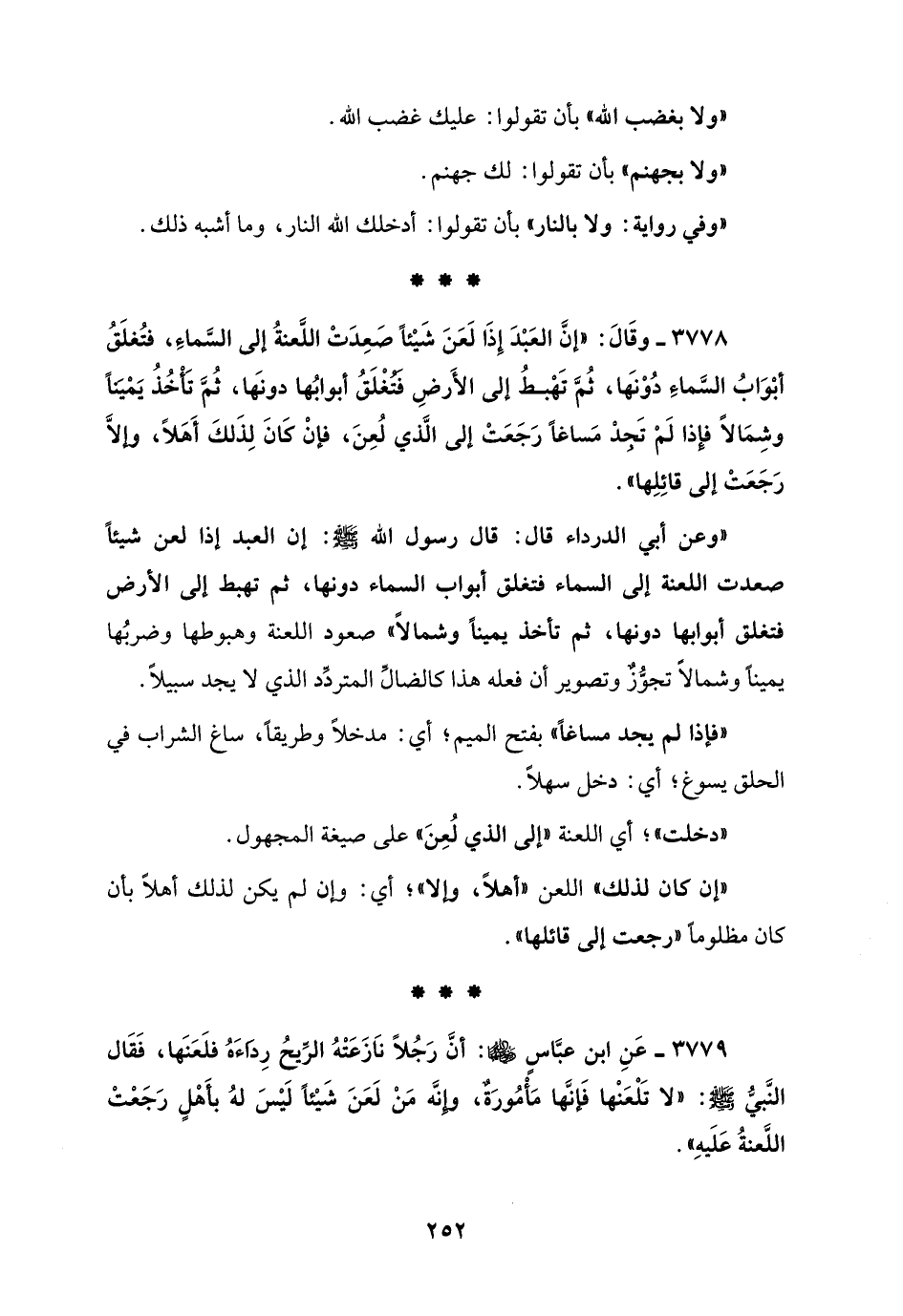 3778 - وقَالَ: "إنَّ العَبْدَ إِذَا لَعَنَ شَيْئاً صَعِدَتْ اللَّعنةُ إلى السَّماءِ، فتُغلَقُ أبْوَابُ السَّماءِ دُوْنها، ثُم تَهْبطُ إلى الأَرضِ فتغْلَقُ أبوابُها دونها، ثُمَّ تأخُذُ يَمينًا وشِمَالاً فإذا لَمْ تَجد مَساغاً رَجَعَتْ إلى الَّذي لُعِنَ، فإنْ كَانَ لِذَلكَ أَهلاً، وإلَّا رَجَعَتْ إلى قائِلِها".