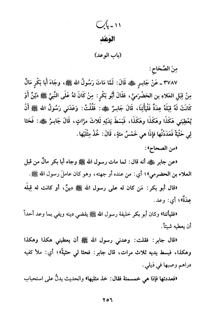 3787 - عَنْ جَابرٍ - صلى الله عليه وسلم - قَالَ: لَمَّا مَاتَ رَسُولُ الله - صلى الله عليه وسلم -، وجَاءَ أَبا بَكْرٍ مَالٌ مِنْ قِبَلِ العَلاءَ بن الحَضْرَميِّ، فقَالَ أبَو بَكْر: مِنْ كَانَ لهُ عَلَى النَّبيِّ - صلى الله عليه وسلم - دين أَوْ كَانَتْ لَهُ قِبَلَهُ عِدَةٌ فَلْيَأتِنَا، قَالَ جَابرٌ - رضي الله عنه -: فَقُلْتُ: وَعَدَني رَسُولُ الله - صلى الله عليه وسلم - أَنْ يُعطِينيَ هكَذَا وهكَذَا وهكَذَا، فَبَسَطَ يَدَيْهِ ثَلاثَ مرَّاتٍ، قَالَ جَابرُ - رضي الله عنه -: فَحَثا لِي حَثْيَةً فَعَددتُها فإِذَا هي خَمس مئةٍ، قَالَ: خُذْ مِثْلَيْها.