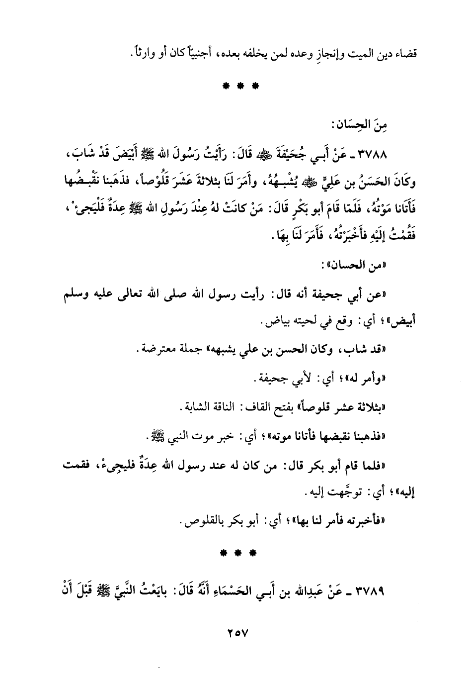 3788 - عَنْ أَبي جُحَيْفَةَ - رضي الله عنه - قَالَ: رَأَيْتُ رَسُولَ الله - صلى الله عليه وسلم - أَبْيَضَ قَدْ شَابَ، وكَانَ الحَسَنُ بن عَلِيٍّ - رضي الله عنه -؛ يُشْبهُهُ، وأَمَرَ لَنَا بثلاثةَ عَشَرَ قَلُوْصاً، فذَهبنا نَقْبضُها فَأَتَانا مَوْتُهُ، فَلَمَّا قَامَ أبو بَكْرٍ قَالَ: مَنْ كانَتْ لهُ عِنْدَ رَسُولِ الله - صلى الله عليه وسلم - عِدة فَلْيَجئْ، فَقُمتُ إلَيْهِ فأَخْبَرْتُهُ، فَأَمَرَ لَنَا بِها.