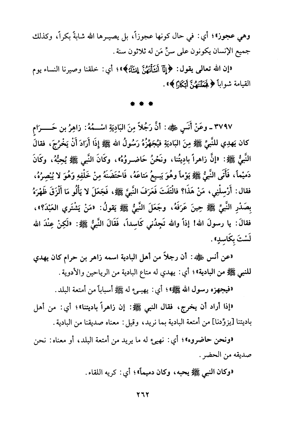 3797 - وعَنْ أَنسٍ - رضي الله عنه -: أنَّ رَجُلاً مِنَ البَادِيَةِ اسْمُهُ: زاهِرُ بن حَرَامٍ كان يَهدِي للنَّبي - صلى الله عليه وسلم - مِنَ البَاديَةِ فيُجَهِّزُهُ رَسُولُ الله - صلى الله عليه وسلم - إِذَا أَرَادَ أَنْ يَخْرُجَ، فقالَ النَّبيُّ - صلى الله عليه وسلم -: "إنَّ زاهراً بادِيتُنا، ونَحْنُ حَاضروُه"، وكَانَ النَّبي - صلى الله عليه وسلم - يُحِبُّهُ، وكَانَ دَميْماً، فَأَتَى النَّبيّ - صلى الله عليه وسلم - يَوْماً وهُوَ يَبيعُ مَتاعَهُ، فَاحْتَضَنَهُ مِنْ خَلْفِهِ وَهُوَ لا يُبْصِرُهُ، فقال: أَرسِلْنِي، مَنْ هذَا؟ فالْتَفَتَ فَعَرَفَ النَّبيَّ - صلى الله عليه وسلم -، فَجَعَلَ لا يَأْلُو مَا ألزَقَ ظَهْرَهُ بِصدرِ النَّبيِّ - صلى الله عليه وسلم - حِينَ عَرَفَهُ، وجَعَلَ النَّبيّ - صلى الله عليه وسلم - يَقولُ: "مَنْ يَشْتَري العَبْدَ؟ "، فقالَ: يا رسولَ الله! إذاً والله تَجدُني كَاسِداً، فَقَالَ النَّبيّ - صلى الله عليه وسلم -: "لَكِنْ عِنْدَ الله لَسْتَ بِكَاسِدٍ".