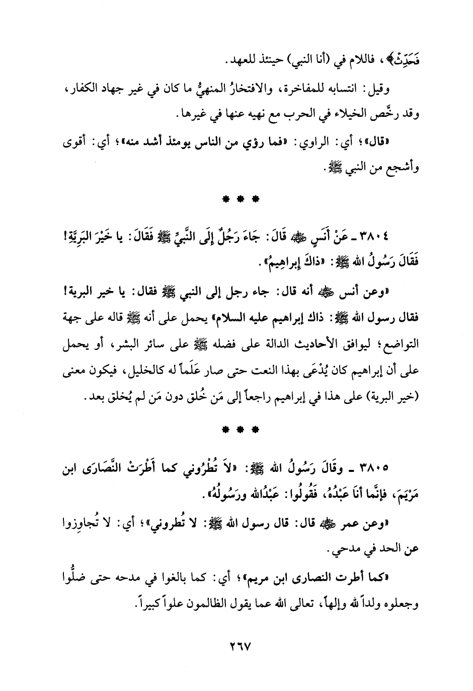 3805 - وقَالَ رَسُولُ الله - صلى الله عليه وسلم -: "لاَ تُطْرُوني كما أَطْرَتْ النَّصَارَى ابن مَرْيَمَ، فإنَّما أنَا عَبْدُهُ، فَقُولُوا: عَبْدُ الله ورَسُولُهُ".