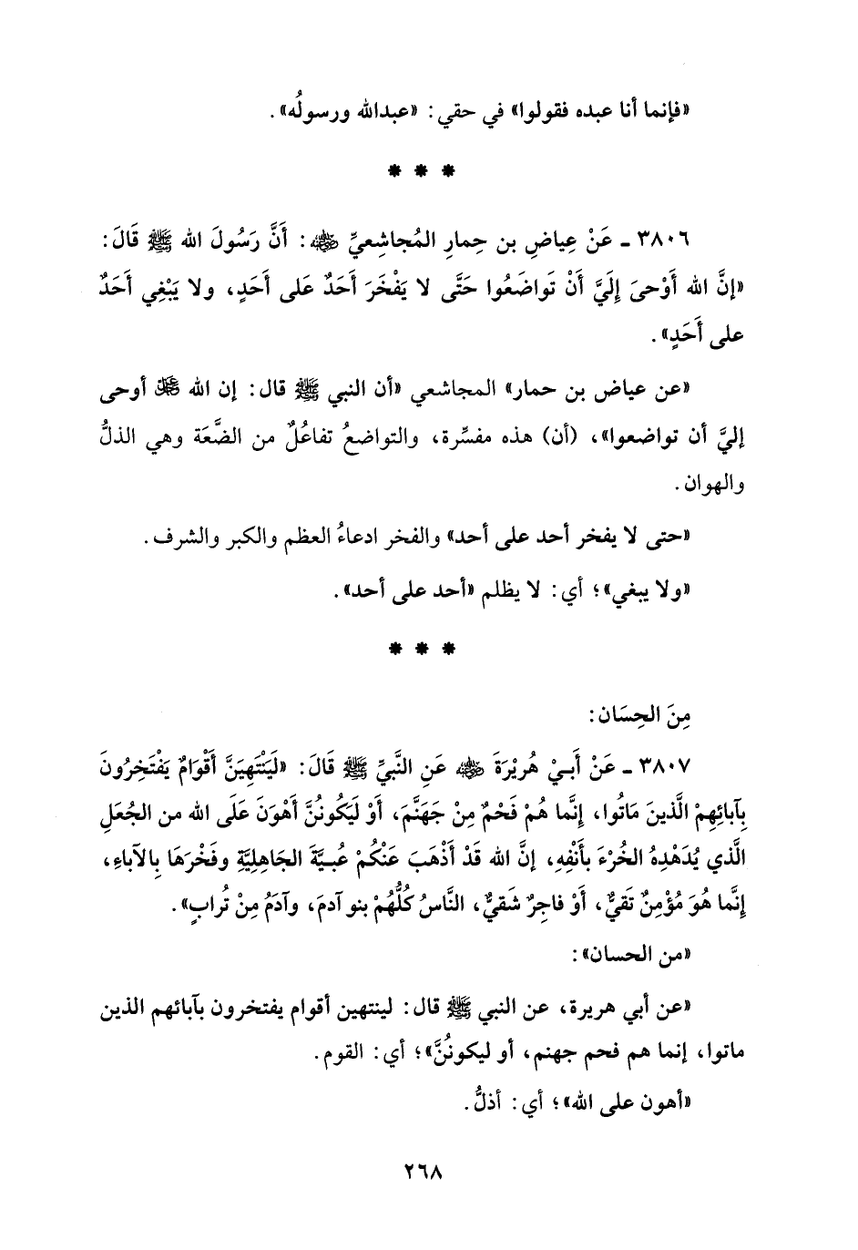 3806 - عَنْ عِياضِ بن حِمارِ المُجاشِعيِّ - رضي الله عنه -: أَنَّ رَسُولَ الله - صلى الله عليه وسلم - قَالَ: "إنَّ اللهَ أَوْحىَ إِلَيَّ أَنْ تَواضَعُوا حَتَّى لا يَفْخَرَ أَحَدٌ عَلى أَحَدٍ، ولا يَبْغِي أَحدٌ على أَحَدٍ".