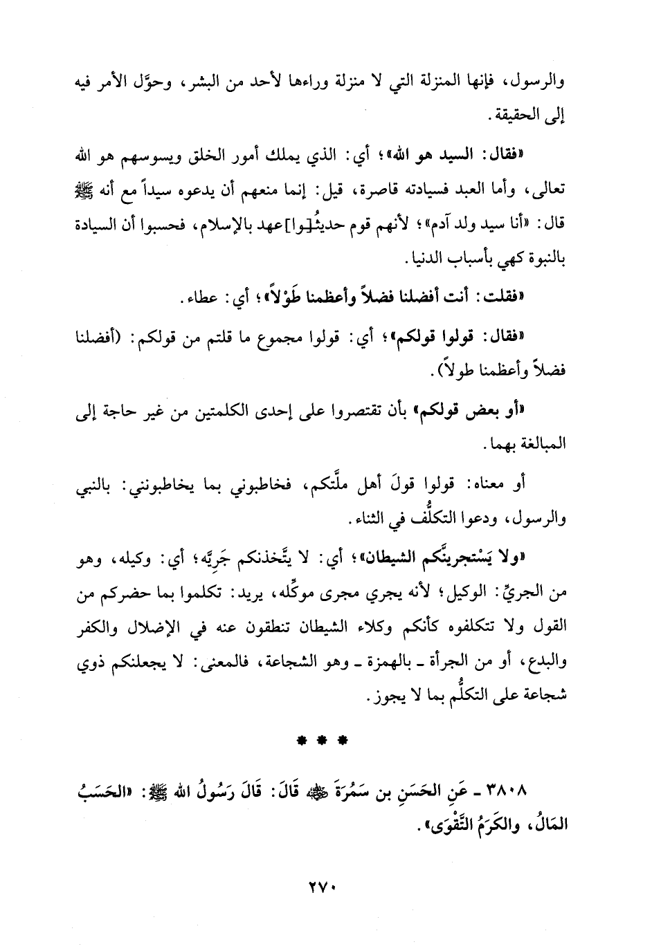 3808 - عَنِ الحَسَنِ بن سَمُرَةَ - رضي الله عنه - قَالَ: قَالَ رَسُولُ الله - صلى الله عليه وسلم -: "الحَسَبُ المَالُ، والكَرَمُ التَّقْوَى".