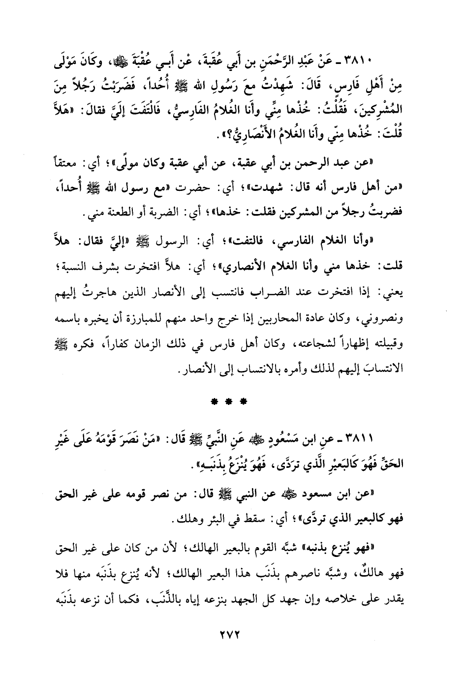 3811 - عنِ ابن مَسْعُودٍ - رضي الله عنه - عَنِ النَّبيِّ - صلى الله عليه وسلم - قال: "مَنْ نَصَرَ قَوْمَهُ عَلَى غَيْرِ الحَقِّ فَهُوَ كالبَعيْرِ الَّذي ترَدَّى، فَهُوَ يُنْزَعُ بِذَنبَهِ".