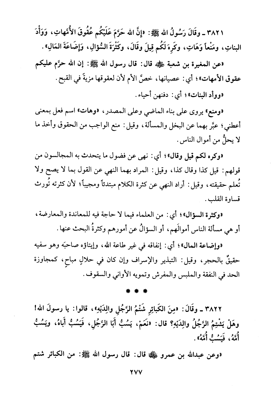 3821 - وقالَ رَسُولُ الله - صلى الله عليه وسلم -: "إِنَّ اللهَ حَرَّمَ عَلَيْكُم عُقُوقَ الأُمَّهاتِ، وَوَأْدَ البناتِ، ومَنْعًا وَهاتِ، وكَرِهَ لَكُم قِيلَ وقالَ، وكَثْرَةَ السُّؤالِ، وَإِضاعَةَ المالِ".