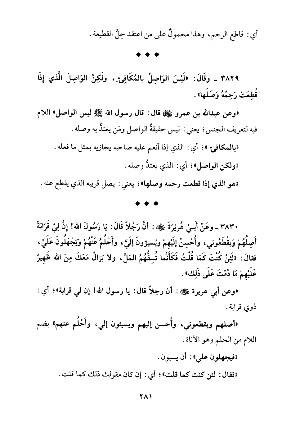 3830 - وعَنْ أَبي هُريرَةَ - رضي الله عنه -: أنَّ رَجُلًا قَالَ: يا رَسُولَ الله! إِنَّ لي قَرابَة أصلُهُمْ وَيقْطَعُوني، وأُحسِنُ إلَيْهِمْ ويُسيؤونَ إلَيَّ، وأَحلُمُ عَنْهُمْ وَيَجْهَلُونَ عَلَيَّ، فقالَ: "لَئِنْ كنْتَ كَما قُلْتُ فَكأَنَّما تُسِفُّهُمُ المَلَّ، ولا يَزالُ مَعَكَ مِنَ الله ظَهِيرٌ عَلَيْهِمْ ما دُمْتَ عَلَى ذَلِك".