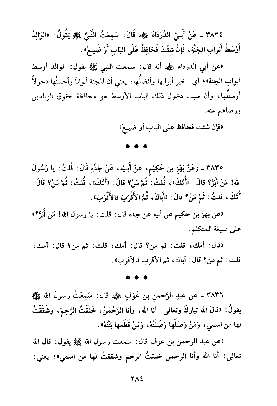 3836 - عن عبدِ الرَّحمنِ بن عَوْفٍ - رضي الله عنه - قال: سَمِعْتُ رسولَ الله - صلى الله عليه وسلم - يقولُ: "قَالَ الله تباركَ وتعالى: أنا الله، وأنا الرّحمنُ، خَلَقْتُ الرَّحِمَ، وشَقَقْتُ لها من اسمي، وَمَنْ وَصَلَها وَصَلْتُهُ، وَمَنْ قَطَعها بَتَتُّهُ".