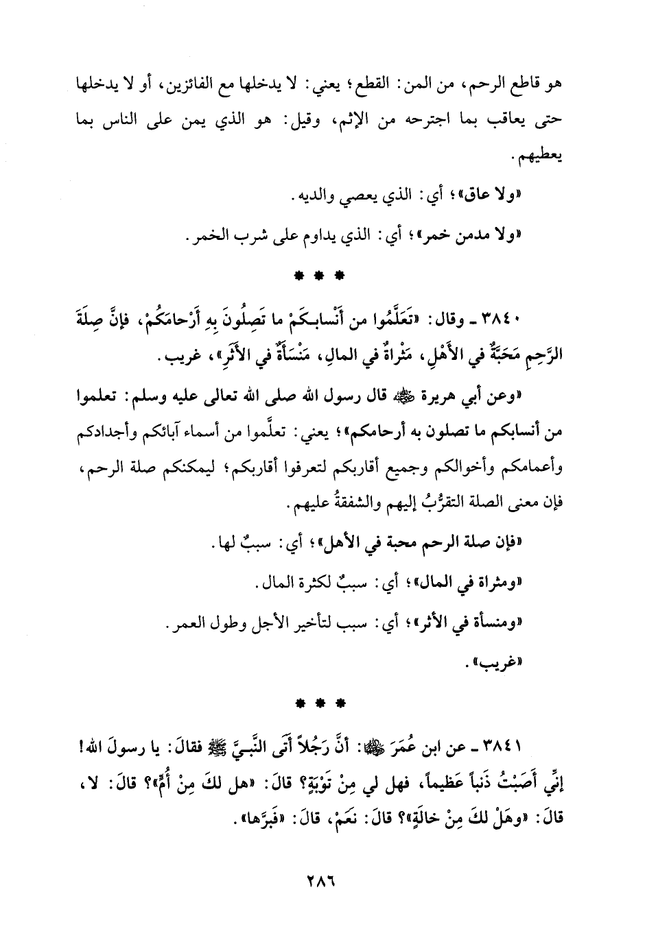 3841 - عن ابن عُمَرَ - رضي الله عنهما -: أنَّ رَجُلًا أتى النَّبي - صلى الله عليه وسلم - فقالَ: يا رسولَ الله! إنِّي أَصَبتُ ذَنبًا عَظيماً، فهل لي مِنْ تَوْبَةٍ؟ قَالَ: "هل لكَ مِنْ أُم"؟ قَالَ: لا، قَالَ: "وهَلْ لكَ مِنْ خالَةٍ"؟ قَالَ: نعَمْ، قَالَ: "فَبرَّها".