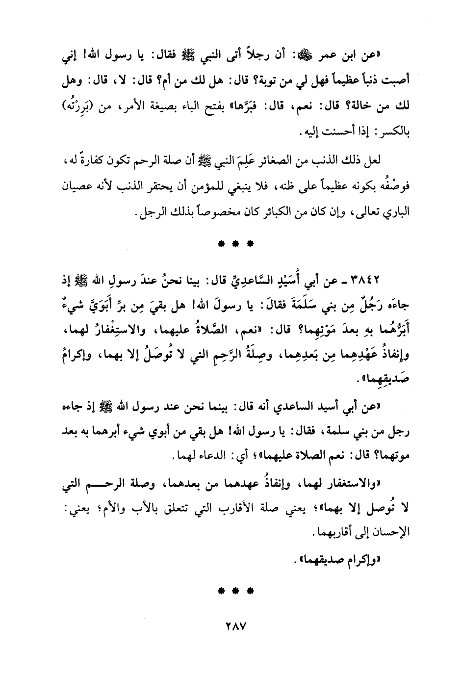 3842 - عن أبي أُسَيْدٍ السّاعدِيِّ قال: بينا نحنُ عندَ رسولِ الله - صلى الله عليه وسلم - إذ جاءَه رَجُل مِن بني سَلَمَةَ فقالَ: يا رسولَ الله! هل بقيَ مِن برِّ أَبَوَيَّ شيءٌ أَبَرُّهُما بهِ بعدَ مَوْتِهِما؟ قال: "نعم، الصَّلاةُ عليهما، والاستِغْفارُ لهما، وإنفاذُ عَهْدِهِما مِن بَعدِهِما، وصِلَةُ الرَّحِم التي لا تُوصَلُ إلا بهما، وإكرامُ صَديقِهِما".