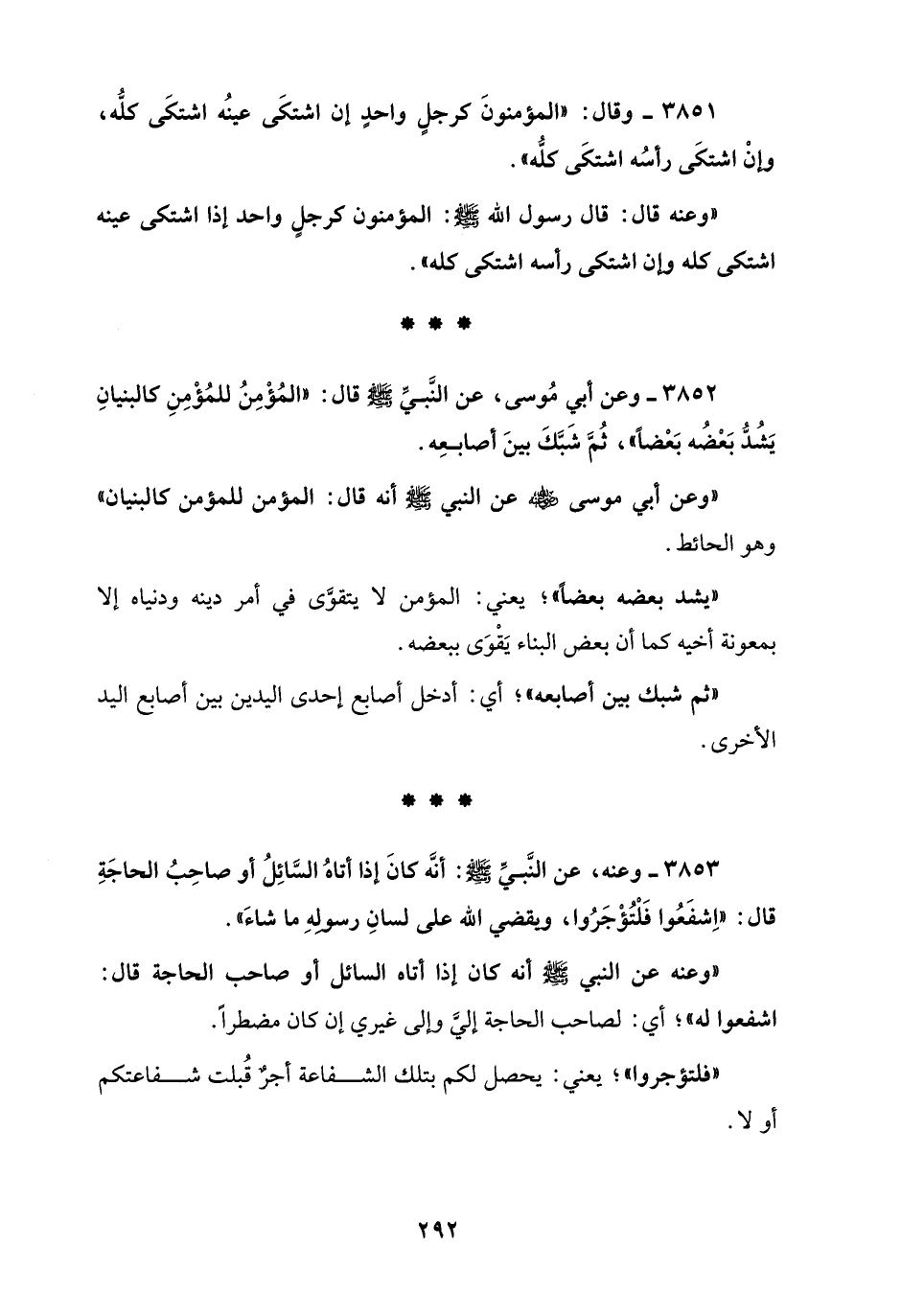 3852 - وعن أبي مُوسى، عن النَّبيِّ - صلى الله عليه وسلم - قال: "المُؤْمِنُ للمُؤْمِنِ كالبنيانِ يَشُدُّ بَعْضُه بَعْضًا"، ثُمَّ شَبَّكَ بينَ أصابعِه.