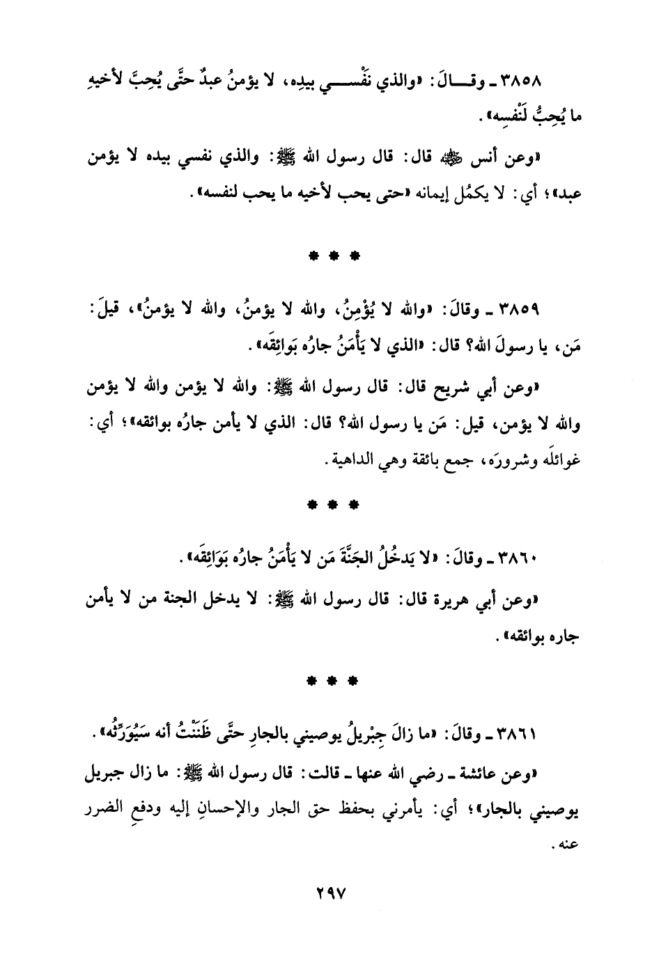"وعن أبي شريح قال: قال رسول الله - صلى الله عليه وسلم -: والله لا يؤمن والله لا يؤمن والله لا يؤمن، قيل: مَن يا رسول الله؟ قال: الذي لا يأمن جارُه بوائقه"؛ أي: غوائلَه وشرورَه، جمع بائقة وهي الداهية.
