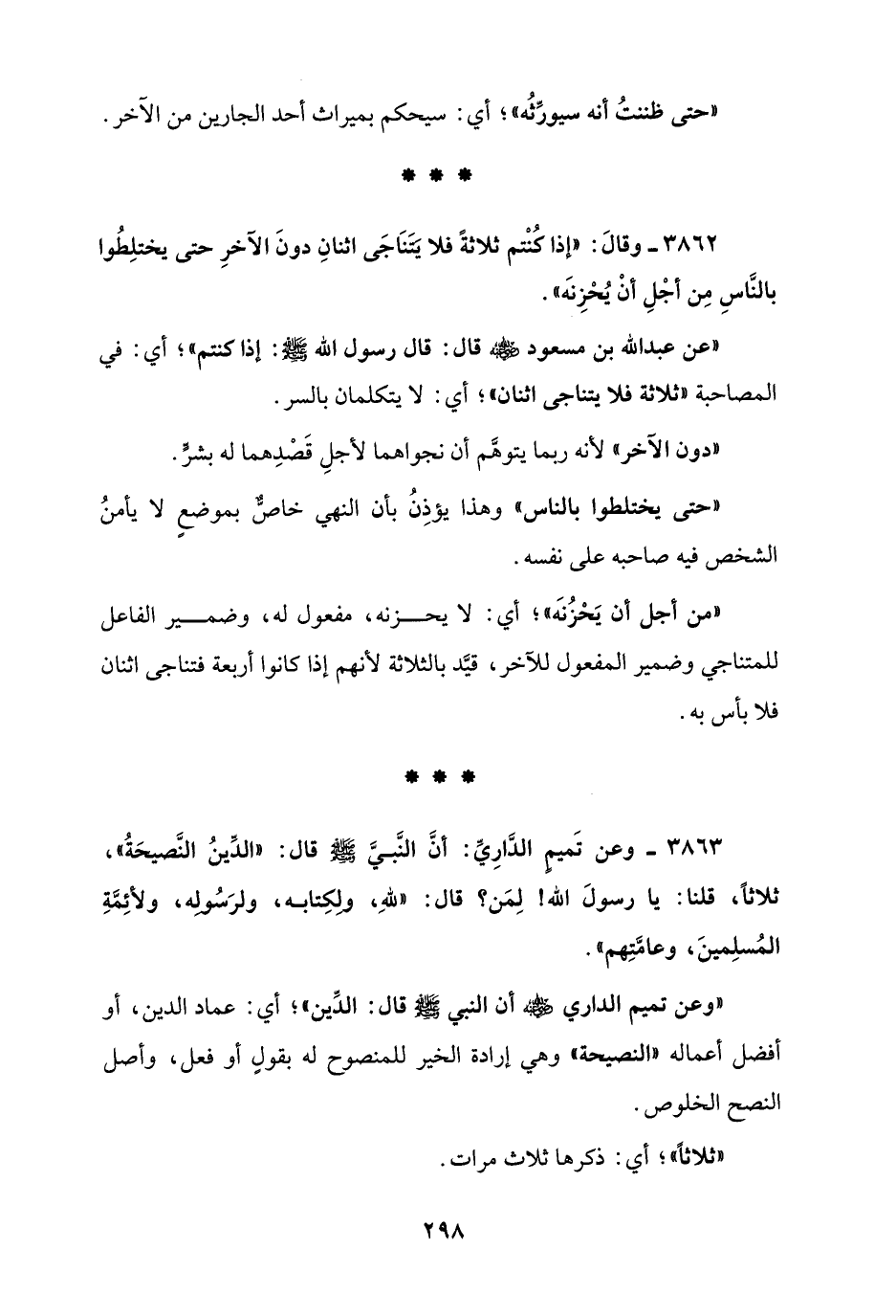 3863 - وعن تَميم الدّارِيِّ: أنَّ النَّبيَّ - صلى الله عليه وسلم - قال: "الدِّينُ النَّصيحَةُ"، ثلاثًا، قلنا: يا رسولَ الله! لِمَن؟ قال: اللهِ، ولكِتابه، ولرَسُوله، ولأئِمَّةِ المُسلِمينَ، وعامَّتِهم".