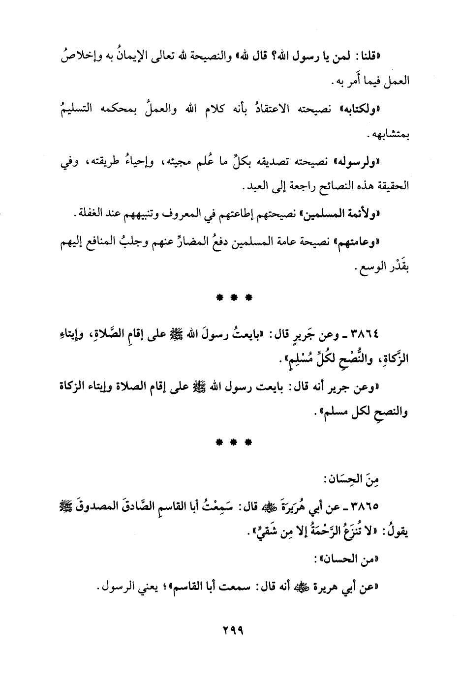 "وعن جرير أنَّه قال: بايعت رسول الله - صلى الله عليه وسلم - على إقام الصلاة وإيتاء الزكاة والنصح لكل مسلم".