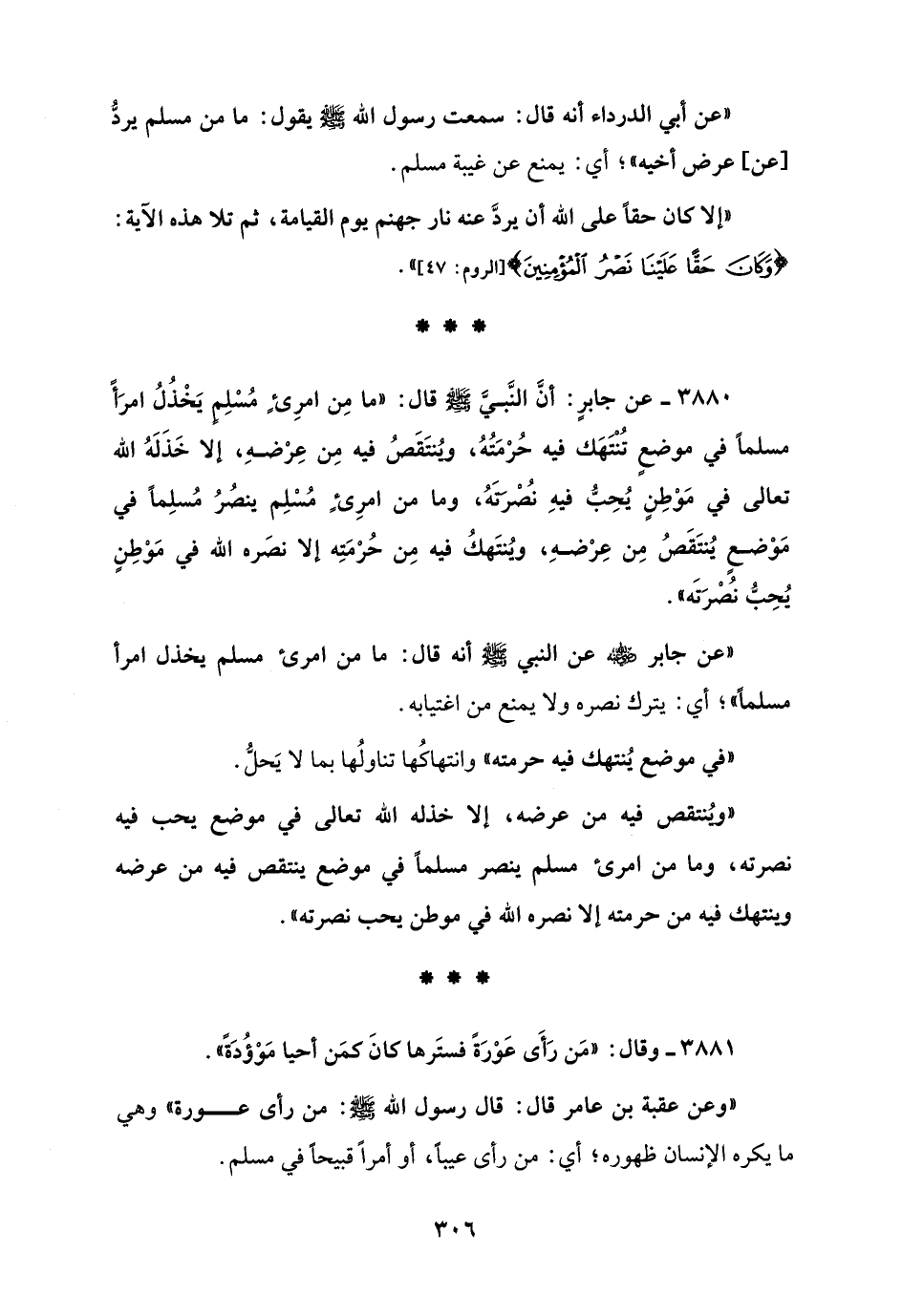 3880 - عن جابرٍ: أنَّ النَّبيَّ - صلى الله عليه وسلم - قال: "ما مِن امرئٍ مُسْلِم يَخْذُلُ امرَأً مسلمًا في موضعٍ تُنْتَهَك فيه حُرمَتُهُ، ويُنتَقَصُ فيه مِن عِرضهِ، إلا خَذَلَهُ الله تعالى في مَوْطِنٍ يُحِبُّ فيهِ نصرتهُ، وما من امرئٍ مُسْلِم ينصُرُ مُسلِمًا في مَوْضعٍ يُنتَقَصُ مِن عِرضهِ، ويُنتَهكُ فيه مِن حُرمَتِه إلا نصَره الله في مَوْطِنٍ يُحِبّ نُصرَتَه".