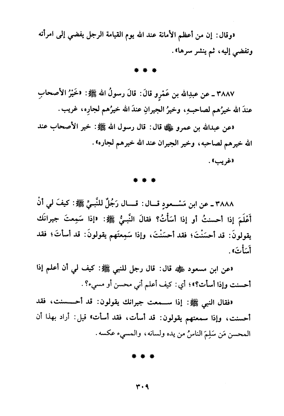 3888 - عن ابن مَسْعودٍ قال: قال رَجُل للنَّبيِّ - صلى الله عليه وسلم -: كيفَ لي أنْ أَعْلَمَ إذا أحسنتُ أو إذا أسَأتُ؟ فقالَ النَّبيُّ - صلى الله عليه وسلم -: "إذا سَمِعتَ جيرانَك يقولونَ: قد أحسَنْتَ؛ فقد أحسَنْتَ، وإذا سَمِعتَهم يقولونَ: قد أسأتَ؛ فقد أَسَأتَ".