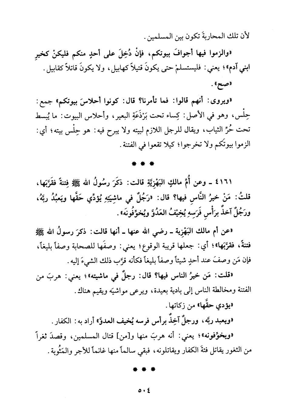 4161 - وعن أُمِّ مالكٍ البَهْزِيَّةِ قالت: ذكَرَ رسُولُ الله - صلى الله عليه وسلم - فِتنةً فقَرَّبَها، قلتُ: مَنْ خيرُ النَّاسِ فيها؟ قال: "رَجُلٌ في ماشِيَتِهِ يُؤدِّي حَقَّها ويَعبُدُ ربَّهُ، ورَجُلٌ آخذٌ برَأْسِ فَرَسِهِ يُخِيْفُ العَدُوَّ ويُخوِّفُونَه".