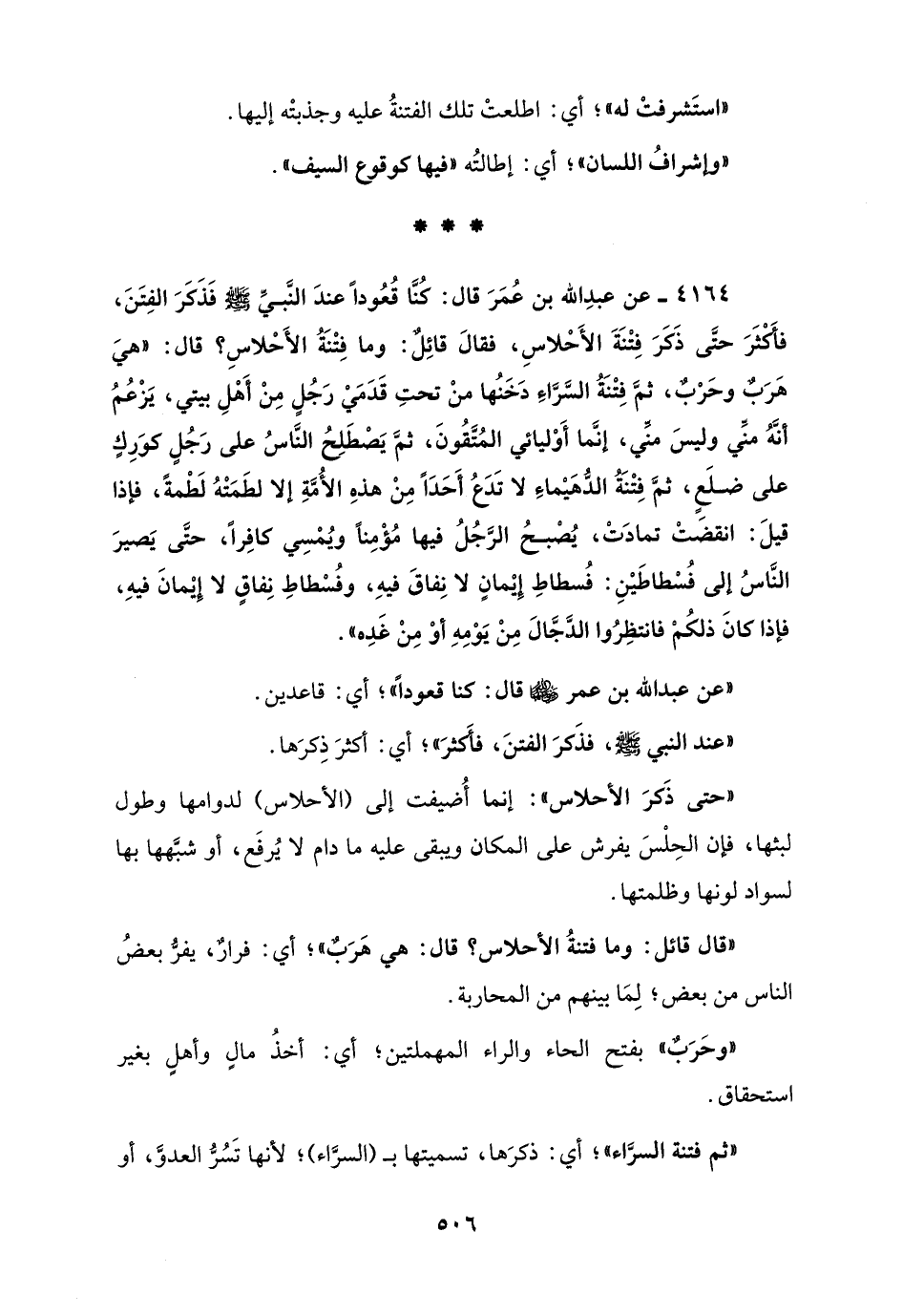 4164 - عن عبدِ الله بن عُمَرَ قال: كُنَّا قُعُوداً عندَ النَّبيِّ - صلى الله عليه وسلم - فَذَكَرَ الفِتَنَ، فأَكثَرَ حتَّى ذَكَرَ فِتْنَةَ الأَحْلاسِ، فقالَ قائِلٌ: وما فِتْنَةُ الأَحْلاسِ؟ قال: "هيَ هَرَبٌ وحَرْبٌ، ثمَّ فِتْنَةُ السَّرَّاءِ دَخَنُها منْ تحتِ قَدَمَيْ رَجُلٍ مِنْ أَهْلِ بيتي، يَزْعُمُ أنَّهُ منِّي وليسَ منِّي، إنَّما أَوْليائي المُتَّقُونَ، ثمَّ يَصْطَلِحُ النَّاسُ على رَجُلٍ كوَرِكٍ على ضلَعٍ، ثمَّ فِتْنَةُ الدُّهَيْماءِ لا تَدَع أَحَدًا مِنْ هذهِ الأُمَّةِ إلا لطَمَتْهُ لَطْمةً، فإذا قيلَ: انقضَتْ تمادَتْ، يُصْبحُ الرَّجُلُ فيها مُؤْمِناً ويُمْسِي كافِراً، حتَّى يَصيرَ النَّاسُ إلى فُسْطاطَيْنِ: فُسطاطِ إِيْمانٍ لا نِفاقَ فيهِ، وفُسْطاطِ نِفاقٍ لا إِيْمانَ فيهِ، فإذا كانَ ذلكُمْ فانتظِرُوا الدَّجَّالَ مِنْ يَوْمِهِ أوْ مِنْ غَدِه".