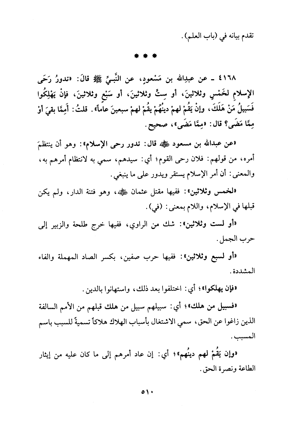 4168 - عن عبدِ الله بن مَسْعودٍ، عن النَّبيِّ - صلى الله عليه وسلم - قالَ: "تدورُ رَحَى الإِسلامِ لخَمْسٍ وثلاثينَ، أو سِتٍّ وثلاثينَ، أو سَبعٍ وثلاثينَ، فإنْ يَهْلِكُوا فَسَبيلُ مَنْ هَلَكَ، وإنْ يَقُم لهمْ دينُهُمْ يقُمْ لهمْ سبعينَ عاماً". قلتُ: "أَمِمَّا بقيَ أوْ مِمَّا مَضَى؟ قال: "مِمَّا مَضى"، صحيح.