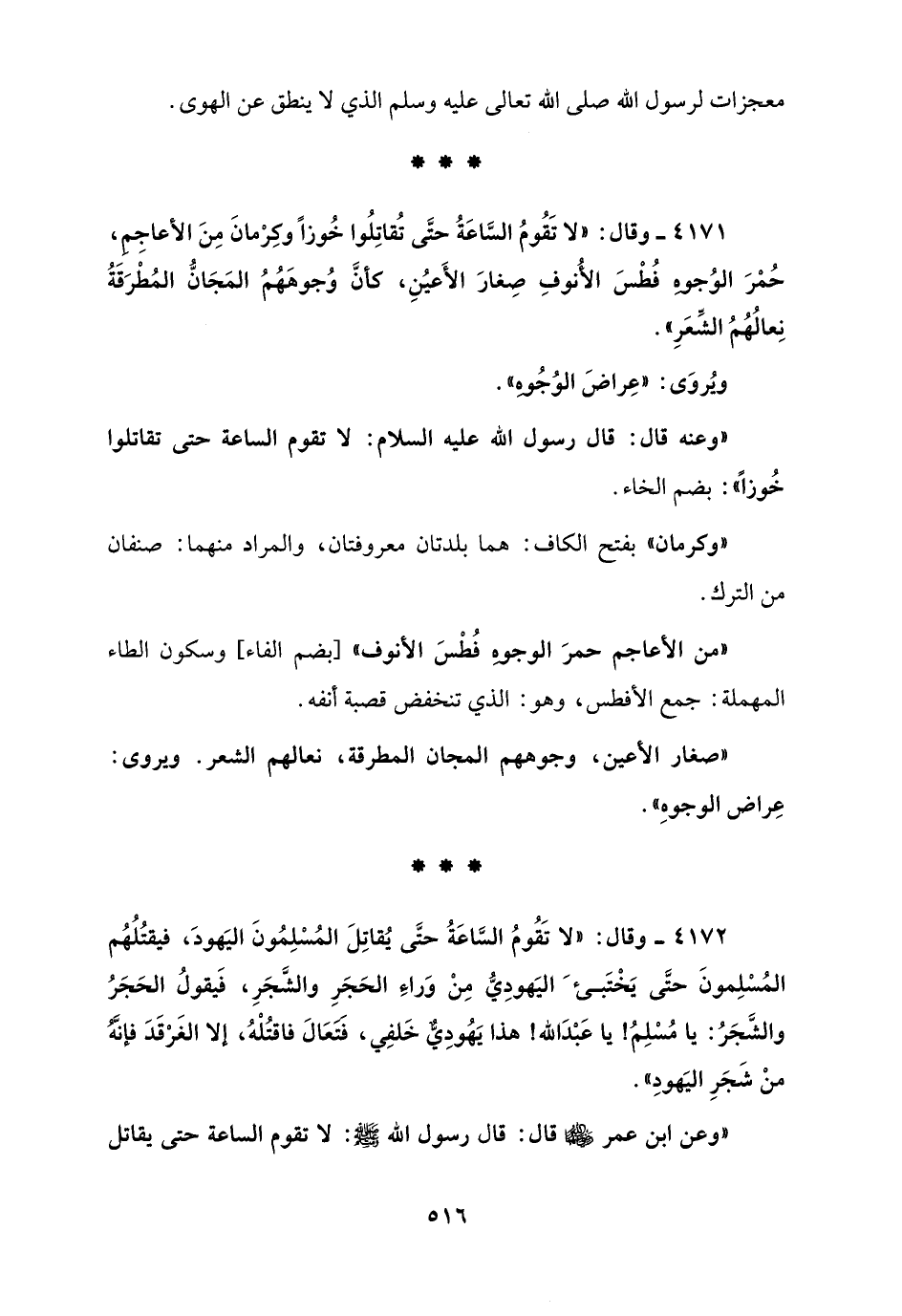 4171 - وقال: "لا تَقُومُ السَّاعَةُ حتَّى تُقاتِلُوا خُوزاً وكِرْمانَ مِنَ الأعاجِمِ، حُمْرَ الوُجوهِ فُطْسَ الأُنوفِ صِغارَ الأَعيُنِ، كأنَّ وُجوهَهُمُ المَجَانُّ المُطْرَقَةُ نِعالُهُمُ الشِّعَرِ".