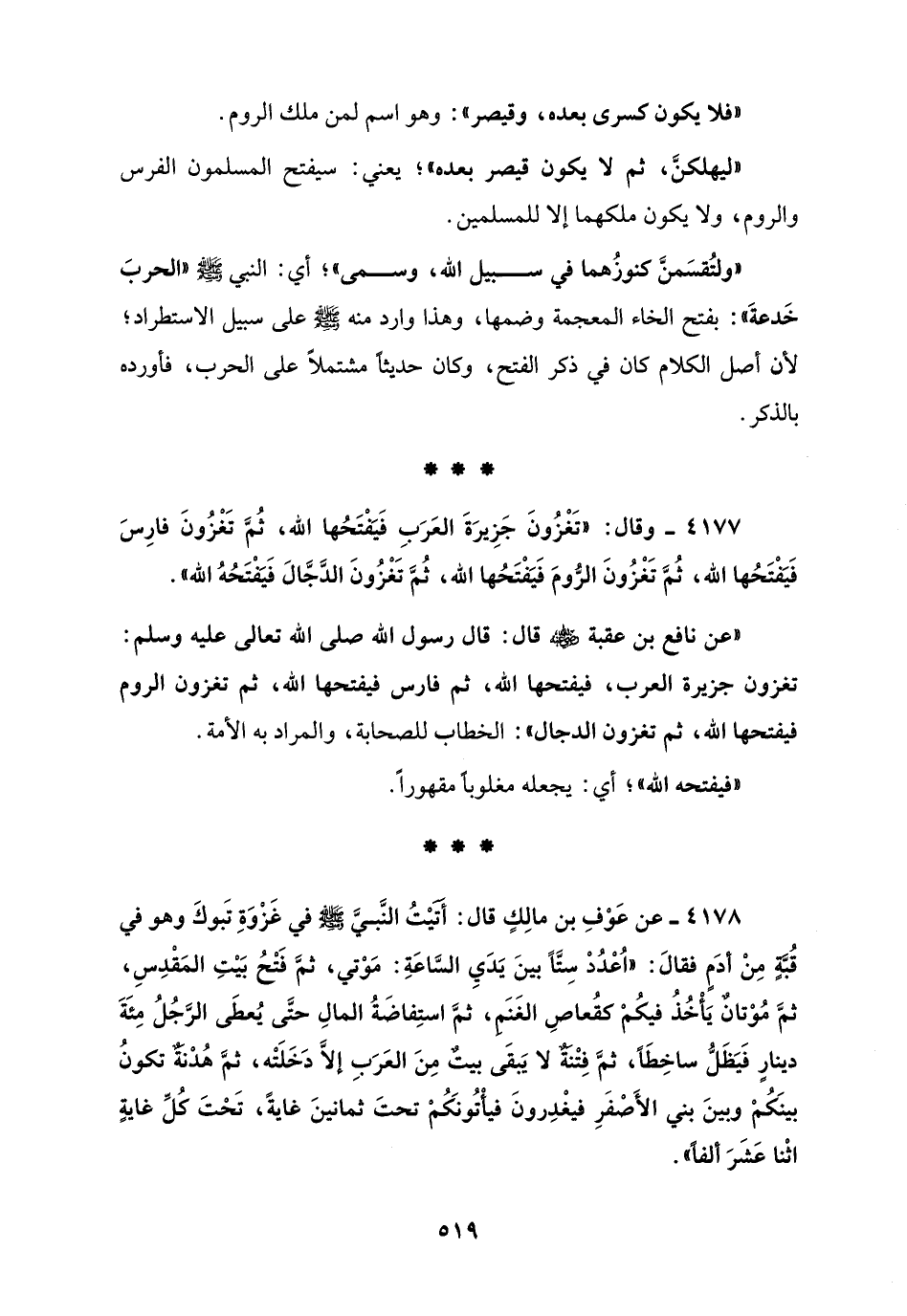 4177 - وقال: "تَغْزُونَ جَزِيرَةَ العَرَبِ فَيَفْتَحُها الله، ثُمَّ تَغْزُونَ فارِسَ فَيَفْتَحُها الله، ثُمَّ تَغْزُونَ الرُّومَ فَيَفْتَحُها الله، ثُمَّ تَغْزُونَ الدَّجَّالَ فَيَفْتَحُهُ الله".
