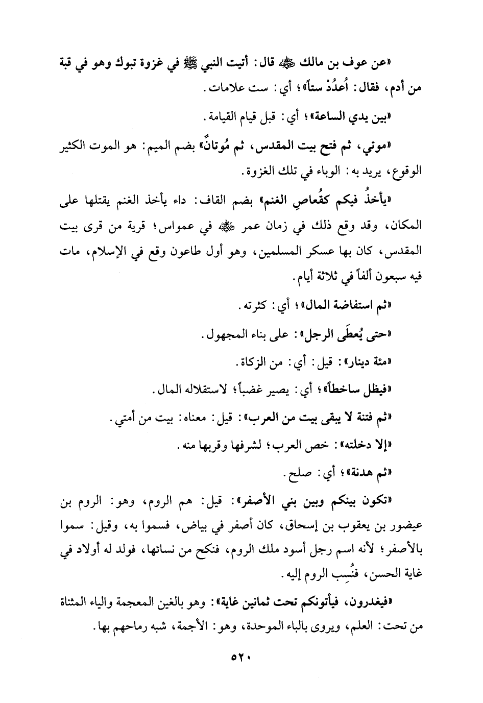 "عن عوف بن مالك - رضي الله عنه - قال: أتيت النبي - صلى الله عليه وسلم - في غزوة تبوك وهو في قبة من أدم، فقال: اُعدُدْ ستاً"؛ أي: ست علامات.