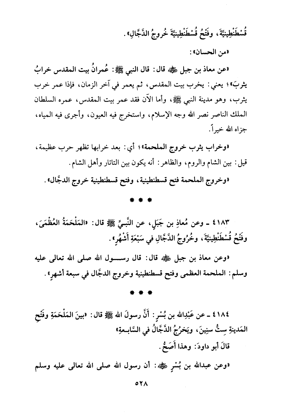 4183 - وعن مُعاذِ بن جَبَلٍ، عن النَّبيِّ - صلى الله عليه وسلم - قال: "المَلْحَمَةُ العُظْمَىَ، وفَتْحُ قُسْطَنْطِينيَّةَ، وخُرُوجُ الدَّجَّالِ في سَبْعَةِ أَشْهُرٍ".