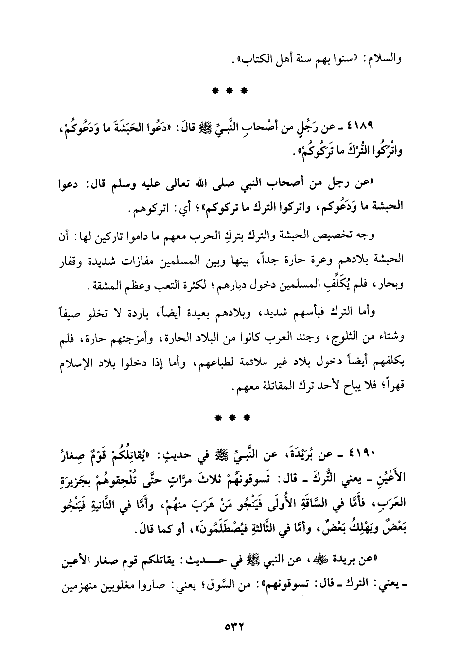وجه تخصيص الحبشة والترك بتركِ الحرب معهم ما داموا تاركين لها: أن الحبشة بلادهم وعرة حارة جداً، بينها وبين المسلمين مفازات شديدة وقفار وبحار، فلم يكَلّفِ المسلمين دخول ديارهم؛ لكثرة التعب وعظم المشقة.