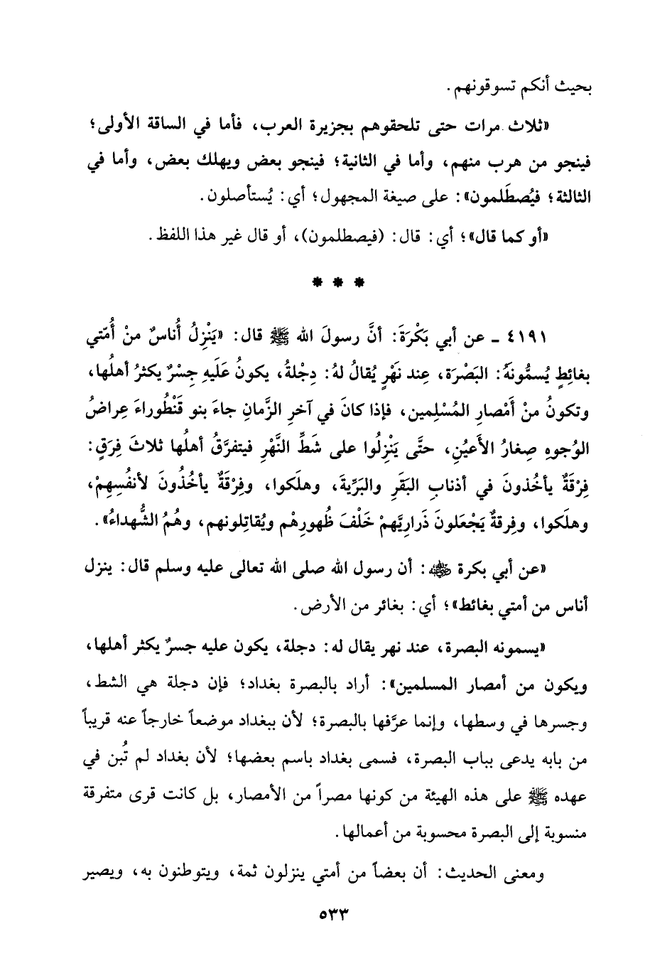 "يسمونه البصرة، عند نهر يقال له: دجلة، يكون عليه جسرٌ يكثر أهلها، ويكون من أمصار المسلمين": أراد بالبصرة بغداد؛ فإن دجلة هي الشط، وجسرها في وسطها، وإنما عرَّفها بالبصرة؛ لأن ببغداد موضعًا خارجًا عنه قريبًا من بابه يدعى بباب البصرة، فسمى بغداد باسم بعضها؛ لأن بغداد لم تُبن في عهده - صلى الله عليه وسلم - على هذه الهيئة من كونها مصراً من الأمصار، بل كانت قرى متفرقة منسوبة إلى البصرة محسوبة من أعمالها.