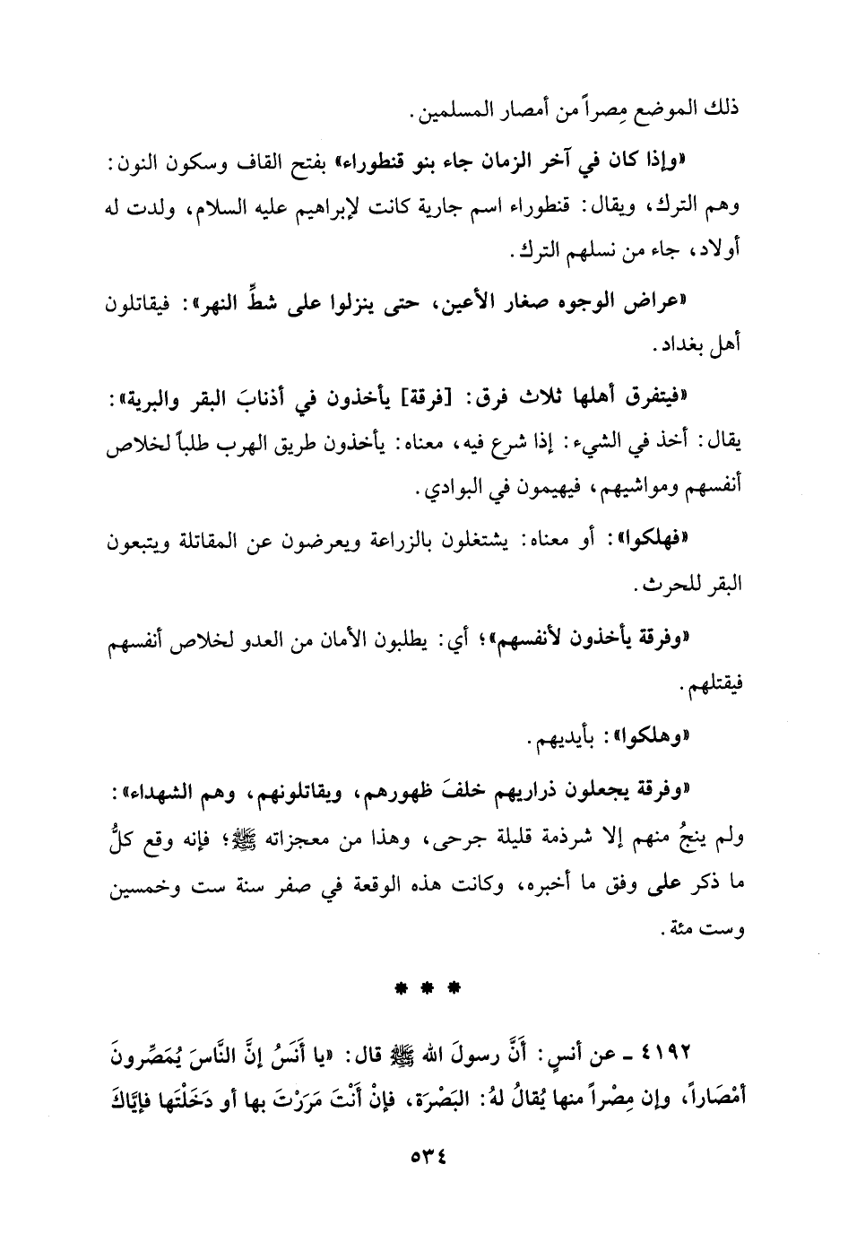 "وفرقة يجعلون ذراريهم خلفَ ظهورهم، ويقاتلونهم، وهم الشهداء": ولم ينجُ منهم إلا شرذمة قليلة جرحى، وهذا من معجزاته - صلى الله عليه وسلم -؛ فإنه وقع كلّ ما ذكر على وفق ما أخبره، وكانت هذه الوقعة في صفر سنة ست وخمسين وست مئة.