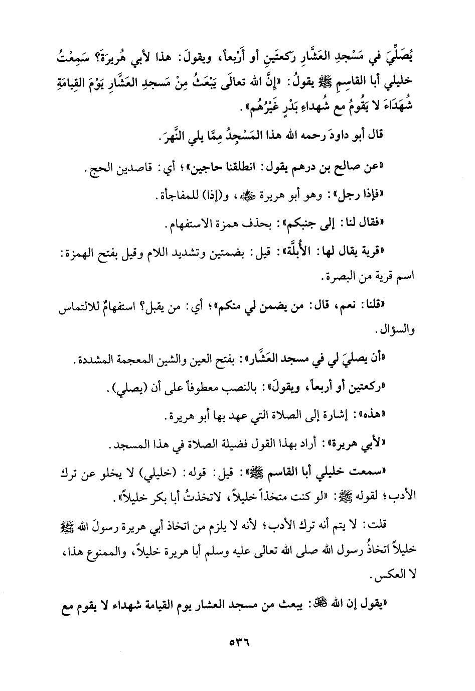 يُصَلِّيَ في مَسْجدِ العَشَّارِ رَكعتَينِ أو أَرْبعاً، ويقولَ: هذا لأبي هُريرَةَ؟ سَمِعْتُ خليلي أبا القاسِم - صلى الله عليه وسلم - يقولُ: "إِنَّ الله تعالَى يَبْعَثُ مِنْ مَسجدِ العَشَّارِ يَوْمَ القِيامَةِ شُهَدَاءَ لا يَقُومُ مع شُهداءِ بَدْرٍ غَيْرُهُم".