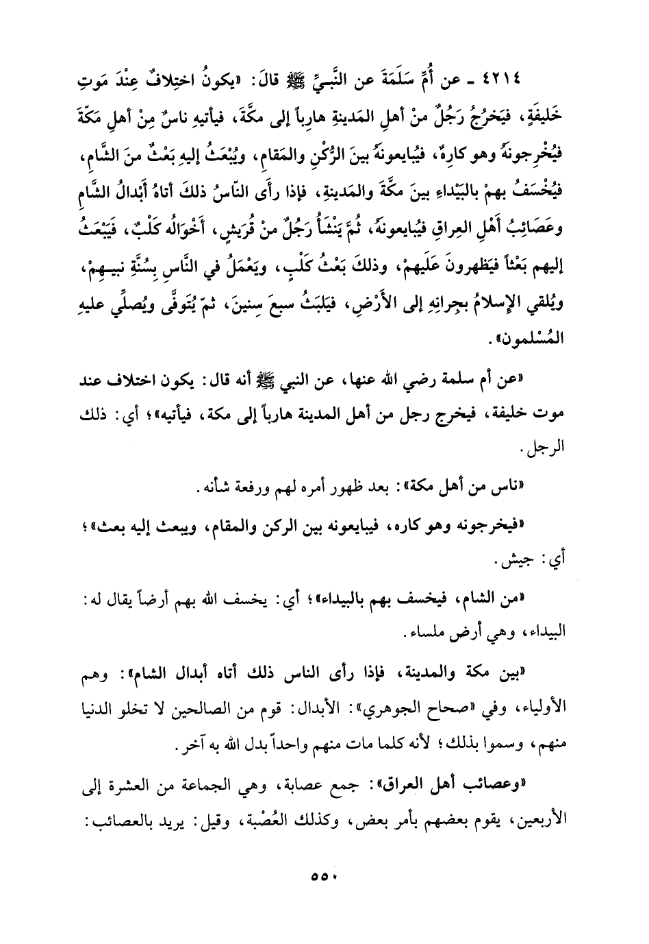 4214 - عن أمِّ سَلَمَةَ عن النَّبيِّ - صلى الله عليه وسلم - قالَ: "يكونُ اختِلافٌ عِنْدَ مَوتِ خَليفَةٍ، فيَخرُجُ رَجُلٌ منْ أهلِ المَدينةِ هارِباً إلى مكَّةَ، فيأتيهِ ناسٌ مِنْ أهلِ مَكّةَ فيُخْرِجونه وهو كارِهٌ، فيُبايعونه بينَ الرُّكنِ والمَقامِ، ويُبْعَثُ إليهِ بَعْثٌ منَ الشَّامِ، فيُخْسَفُ بهمْ بالبَيْداءَ بينَ مكَّةَ والمَدينةِ، فإذا رأَى النّاسُ ذلكَ أتاهُ أَبْدالُ الشَّامِ وعَصَائِبُ أَهْلِ العِراقِ فيُبايعونه، ثُمَّ يَنْشَأُ رَجُلٌ منْ قُرَيشٍ، أَخْوَالُه كلْبٌ، فَيَبْعَثُ إليهم بَعْثاً فيَظهرونَ عَلَيهمْ، وذلكَ بَعْثُ كلْبٍ، ويَعْمَلُ في النَّاسِ بِسُنَّةِ نبيهِمْ، ويُلقي الإِسلامُ بجرانِهِ إلى الأَرْضِ، فيَلبَثُ سبعَ سِنينَ، ثمَّ يُتَوفَّى ويُصلِّي عليهِ المُسْلمون".