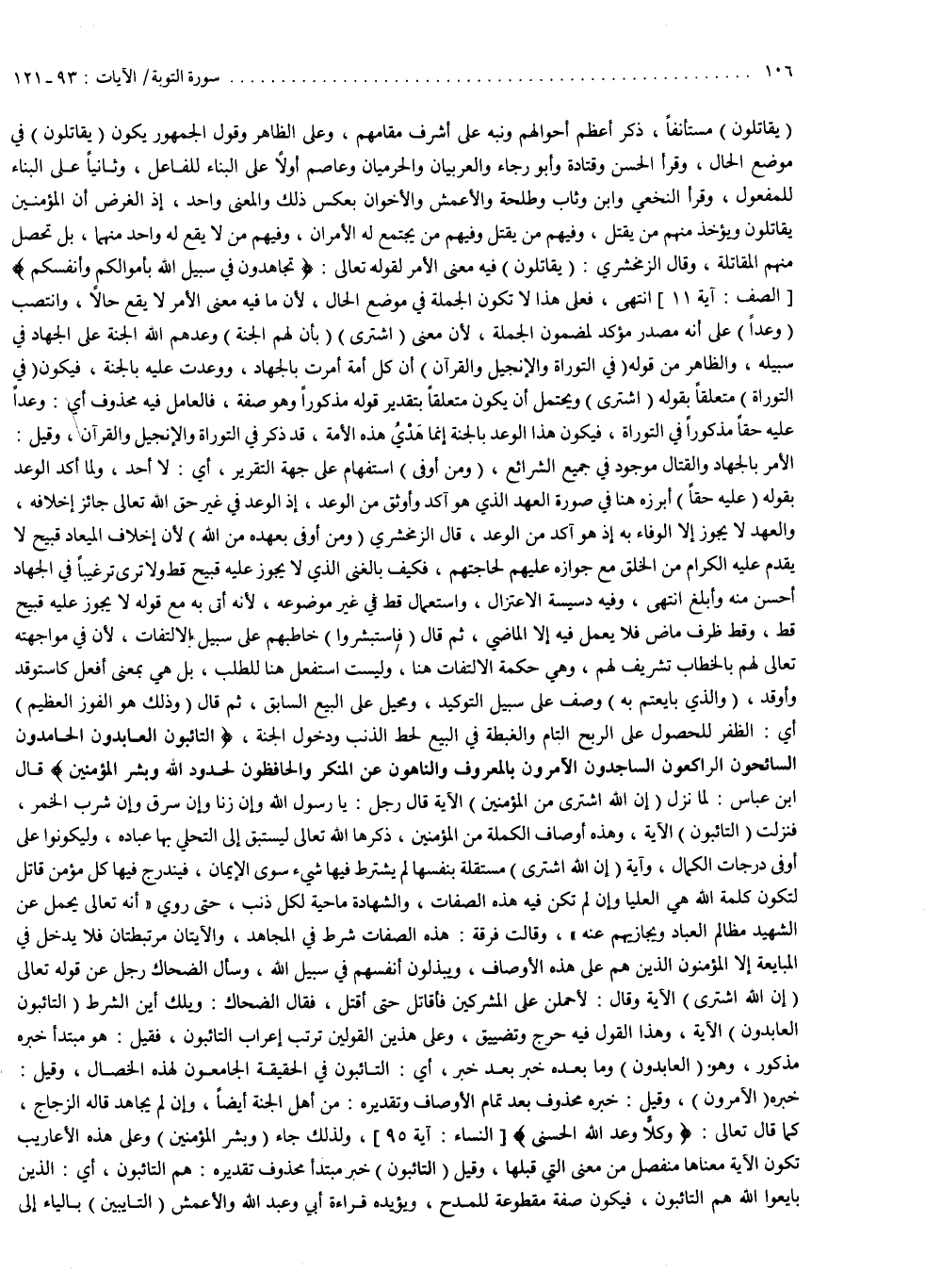 ( التَّائِبُونَ الْعَابِدُونَ الْحَامِدُونَ السَّائِحُونَ الركِعُونَ السَّاجِدونَ الاْمِرُونَ بِالْمَعْرُوفِ وَالنَّاهُونَ عَنِ الْمُنكَرِ وَالْحَافِظُونَ لِحُدُودِ اللَّهِ وَبَشّرِ الْمُؤْمِنِينَ ( : قال ابن عباس : لما نزل أنّ الله اشترى من المؤمنين الآية قال رجل : يا رسول الله وإن زنا ، وإن سرق ، وإن شرب الخمر : فنزلت التائبون الآية . وهذه أوصاف الكملة من المؤمنين ذكرها الله تعالى ليستبق إلى التحلي بها عباده ، وليكونوا على أوفى درجات الكمال . وآية أنّ الله اشترى مستقلة بنفسها ، لم يشترط فيها شيء سوى الإيمان ، فيندرج فيها كل مؤمن قاتل لتكون كلمة الله هي العليا ، وإن لم تكن فيه هذه الصفات . والشهادة ماحية لكل ذنب ، حتى روي أنه تعالى يحمل عن الشهيد مظالم العباد ويجازيهم عنه . وقالت فرقة : هذه الصفات شرط في المجاهد . والآيتان مرتبطتان فلا يدخل في المبايعة إلا المؤمنون الذين هم على هذه الصفات شرط في المجاهد . والآيتان مرتبطتان فلا يدخل في المبايعة إلا المؤمنون الذين هم على هذه الأوصاف ، ويبذلون أنفسهم في سبيل الله . وسأل الضحاك رجل عن قوله تعالى : ) إِنَّ اللَّهَ اشْتَرَى ( الآية وقال : لأحملن على المشركين فأقاتل حتى أقتل ، فقال الضحاك : ويلك أين الشرط التائبون العابدون الآية ؟ وهذا القول فيه حرج وتضييق ، وعلى هذين القولين نرتب إعراب التائبون ، فقيل : هو مبتدأ خبره مذكور وهو العابدون ، وما بعده خبر بعد خبر أي : التائبون في الحقيقة الجامعون لهذه الخصال . وقيل : خبره الآمرون . وقيل : خبره محذوف بعد تمام الأوصاف ، وتقديره : من أهل الجنة أيضاً وإن لم يجاهد قاله الزجاج كما قال تعالى : ) وَكُلاًّ وَعَدَ اللَّهُ الْحُسْنَى ( ولذلك جاء : ) وَبَشّرِ الْمُؤْمِنِينَ ( وعلى هذه الأعاريب تكون الآية معناها منفصل من معنى التي قبلها . وقيل : التائبون خبر مبتدأ محذوف تقديره هم التائبون ، أي الذين بايعوا الله هم التائبون ، فيكون صفة مقطوعة للمدح ، ويؤيده قراءة أبي وعبد الله والأعمش : التايبين بالياء إلى