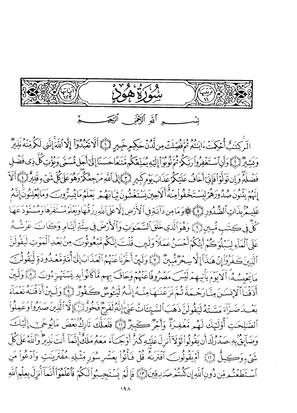 بسم الله الرحمن الرحيم 2 ( ) الر كِتَابٌ أُحْكِمَتْ ءايَاتُهُ ثُمَّ فُصِّلَتْ مِن لَّدُنْ حَكِيمٍ خَبِيرٍ أَلاَّ تَعْبُدُواْ إِلاَّ اللَّهَ إِنَّنِى لَكُمْ مِّنْهُ نَذِيرٌ وَبَشِيرٌ وَأَنِ اسْتَغْفِرُواْ رَبَّكُمْ ثُمَّ تُوبُواْ إِلَيْهِ يُمَتِّعْكُمْ مَّتَاعًا حَسَنًا إِلَى أَجَلٍ مُّسَمًّى وَيُؤْتِ كُلَّ ذِي فَضْلٍ فَضْلَهُ وَإِن تَوَلَّوْاْ فَإِنِّيأَخَافُ عَلَيْكُمْ عَذَابَ يَوْمٍ كَبِيرٍ إِلَى اللَّهِ مَرْجِعُكُمْ وَهُوَ عَلَى كُلِّ شَىْءٍ قَدِيرٌ أَلا إِنَّهُمْ يَثْنُونَ صُدُورَهُمْ لِيَسْتَخْفُواْ مِنْهُ أَلا حِينَ يَسْتَغْشُونَ ثِيَابَهُمْ يَعْلَمُ مَا يُسِرُّونَ وَمَا يُعْلِنُونَ إِنَّهُ عَلِيمٌ بِذَاتِ الصُّدُورِ وَمَا مِن دَآبَّةٍ فِي الاٌّ رْضِ إِلاَّ عَلَى اللَّهِ رِزْقُهَا وَيَعْلَمُ مُسْتَقَرَّهَا وَمُسْتَوْدَعَهَا كُلٌّ فِى كِتَابٍ مُّبِينٍ وَهُوَ الَّذِى خَلَقَ السَّمَاوَاتِ وَالاٌّ رْضَ فِى سِتَّةِ أَيَّامٍ وَكَانَ عَرْشُهُ عَلَى الْمَآءِ لِيَبْلُوَكُمْ أَيُّكُمْ أَحْسَنُ عَمَلاً وَلَئِن قُلْتَ إِنَّكُمْ مَّبْعُوثُونَ مِن بَعْدِ الْمَوْتِ لَيَقُولَنَّ الَّذِينَ كَفَرُواْ إِنْ هَاذَآ إِلاَّ سِحْرٌ مُّبِينٌ وَلَئِنْ أَخَّرْنَا عَنْهُمُ الْعَذَابَ إِلَى أُمَّةٍ مَّعْدُودَةٍ لَّيَقُولُنَّ مَا يَحْبِسُهُ أَلاَ يَوْمَ يَأْتِيهِمْ لَيْسَ مَصْرُوفاً عَنْهُمْ وَحَاقَ بِهِم مَّا كَانُواْ بِهِ يَسْتَهْزِءُونَ وَلَئِنْ أَذَقْنَا الإِنْسَانَ مِنَّا رَحْمَةً ثُمَّ نَزَعْنَاهَا مِنْهُ إِنَّهُ لَيَئُوسٌ كَفُورٌ وَلَئِنْ أَذَقْنَاهُ نَعْمَآءَ بَعْدَ ضَرَّآءَ مَسَّتْهُ لَيَقُولَنَّ ذَهَبَ السَّيِّئَاتُ عَنِّيإِنَّهُ لَفَرِحٌ فَخُورٌ إِلاَّ الَّذِينَ صَبَرُواْ وَعَمِلُواْ الصَّالِحَاتِ أُوْلَائِكَ لَهُمْ مَّغْفِرَةٌ وَأَجْرٌ كَبِيرٌ فَلَعَلَّكَ تَارِكٌ بَعْضَ مَا يُوحَى إِلَيْكَ وَضَآئِقٌ بِهِ صَدْرُكَ أَن يَقُولُواْ لَوْلاَ أُنُزِلَ عَلَيْهِ كَنزٌ أَوْ جَآءَ مَعَهُ مَلَكٌ إِنَّمَآ أَنتَ نَذِيرٌ وَاللَّهُ عَلَى كُلِّ شَىْءٍ وَكِيلٌ أَمْ يَقُولُونَ افْتَرَاهُ قُلْ فَأْتُواْ بِعَشْرِ سُوَرٍ مِّثْلِهِ مُفْتَرَيَاتٍ وَادْعُواْ مَنِ اسْتَطَعْتُمْ مِّن دُونِ اللَّهِ إِن كُنتُمْ صَادِقِينَ فَإِلَّمْ يَسْتَجِيبُواْ لَكُمْ فَاعْلَمُواْ أَنَّمَآ أُنزِلِ بِعِلْمِ اللَّه