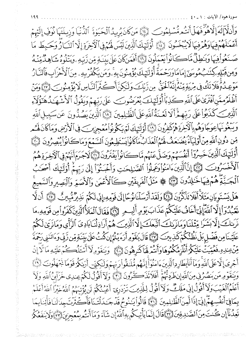وَأَن لاَّ إِلَاهَ إِلاَّ هُوَ فَهَلْ أَنتُمْ مُّسْلِمُونَ مَن كَانَ يُرِيدُ الْحَيَواةَ الدُّنْيَا وَزِينَتَهَا نُوَفِّ إِلَيْهِمْ أَعْمَالَهُمْ فِيهَا وَهُمْ فِيهَا لاَ يُبْخَسُونَ أُوْلَائِكَ الَّذِينَ لَيْسَ لَهُمْ فِى الاٌّ خِرَةِ إِلاَّ النَّارُ وَحَبِطَ مَا صَنَعُواْ فِيهَا وَبَاطِلٌ مَّا كَانُواْ يَعْمَلُونَ أَفَمَن كَانَ عَلَى بَيِّنَةٍ مِّن رَّبِّهِ وَيَتْلُوهُ شَاهِدٌ مِّنْهُ وَمِن قَبْلِهِ كِتَابُ مُوسَى إَمَامًا وَرَحْمَةً أُوْلَائِكَ يُؤْمِنُونَ بِهِ وَمَن يَكْفُرْ بِهِ مِنَ الاٌّ حْزَابِ فَالنَّارُ مَوْعِدُهُ فَلاَ تَكُ فِى مِرْيَةٍ مِّنْهُ إِنَّهُ الْحَقُّ مِن رَّبِّكَ وَلَاكِنَّ أَكْثَرَ النَّاسِ لاَ يُؤْمِنُونَ وَمَنْ أَظْلَمُ مِمَّنِ افْتَرَى عَلَى اللَّهِ كَذِبًا أُوْلَائِكَ يُعْرَضُونَ عَلَى رَبِّهِمْ وَيَقُولُ الاٌّ شْهَادُ هَاؤُلاءِ الَّذِينَ كَذَبُواْ عَلَى رَبِّهِمْ أَلاَ لَعْنَةُ اللَّهِ عَلَى الظَّالِمِينَ الَّذِينَ يَصُدُّونَ عَن سَبِيلِ اللَّهِ وَيَبْغُونَهَا عِوَجًا وَهُمْ بِالاٌّ خِرَةِ هُمْ كَافِرُونَ أُولَائِكَ لَمْ يَكُونُواْ مُعْجِزِينَ فِى الاٌّ رْضِ وَمَا كَانَ لَهُمْ مِّن دُونِ اللَّهِ مِنْ أَوْلِيَآءَ يُضَاعَفُ لَهُمُ الْعَذَابُ مَا كَانُواْ يَسْتَطِيعُونَ السَّمْعَ وَمَا كَانُواْ يُبْصِرُونَ أُوْلَائِكَ الَّذِينَ خَسِرُواْ أَنفُسَهُمْ وَضَلَّ عَنْهُمْ مَّا كَانُواْ يَفْتَرُونَ لاَ جَرَمَ أَنَّهُمْ فِى الاٌّ خِرَةِ هُمُ الاٌّ خْسَرُونَ إِنَّ الَّذِينَ ءَامَنُواْ وَعَمِلُواْ الصَّالِحَاتِ وَأَخْبَتُواْ إِلَى رَبِّهِمْ أُوْلَائِكَ أَصْحَابُ الجَنَّةِ هُمْ فِيهَا خَالِدُونَ مَثَلُ الْفَرِيقَيْنِ كَالاٌّ عْمَى وَالاٌّ صَمِّ وَالْبَصِيرِ وَالسَّمِيعِ هَلْ يَسْتَوِيَانِ مَثَلاً أَفَلاَ تَذَكَّرُونَ وَلَقَدْ أَرْسَلْنَا نُوحًا إِلَى قَوْمِهِ إِنَّى لَكُمْ نَذِيرٌ مُّبِينٌ أَن لاَّ تَعْبُدُواْ إِلاَّ اللَّهَ إِنِّىأَخَافُ عَلَيْكُمْ عَذَابَ يَوْمٍ أَلِيمٍ فَقَالَ الْمَلأُ الَّذِينَ كَفَرُواْ مِن قِوْمِهِ مَا نَرَاكَ إِلاَّ بَشَرًا مِّثْلَنَا وَمَا نَرَاكَ اتَّبَعَكَ إِلاَّ الَّذِينَ هُمْ أَرَاذِلُنَا بَادِىَ الرَّأْى وَمَا نَرَى لَكُمْ عَلَيْنَا مِن فَضْلٍ بَلْ نَظُنُّكُمْ كَاذِبِينَ قَالَ ياقَوْمِ أَرَأَيْتُمْ إِن كُنتُ عَلَى بَيِّنَةٍ مِّن رَّبِّىوَءاتَانِى رَحْمَةً مِّنْ عِندِهِ فَعُمِّيَتْ عَلَيْكُمْ أَنُلْزِمُكُمُوهَا وَأَنتُمْ لَهَا كَارِهُونَ وَياقَوْمِ لاأَسْأَلُكُمْ عَلَيْهِ مَالاً إِنْ أَجْرِىَ إِلاَّ عَلَى اللَّهِ وَمَآ أَنَاْ بِطَارِدِ الَّذِينَ ءامَنُواْ إِنَّهُمْ مُّلاَقُو رَبِّهِمْ وَلَاكِنِّىأَرَاكُمْ قَوْمًا تَجْهَلُونَ وَياقَوْمِ مَن يَنصُرُنِى مِنَ اللَّهِ إِن طَرَدتُّهُمْ أَفَلاَ تَذَكَّرُونَ وَلاَ أَقُولُ لَكُمْ عِندِى خَزَآئِنُ اللَّهِ وَلاَ أَعْلَمُ الْغَيْبَ وَلاَ أَقُولُ إِنِّى مَلَكٌ وَلاَ أَقُولُ لِلَّذِينَ تَزْدَرِىأَعْيُنُكُمْ لَن يُؤْتِيَهُمُ اللَّهُ خَيْرًا اللَّهُ أَعْلَمُ بِمَا فِى أَنفُسِهِمْ إِنِّىإِذًا لَّمِنَ الظَّالِمِينَ قَالُواْ يانُوحُ قَدْ جَادَلْتَنَا فَأَكْثَرْتَ جِدَالَنَا فَأْتَنِا بِمَا تَعِدُنَآ إِن كُنتَ مِنَ الصَّادِقِينَ قَالَ إِنَّمَا يَأْتِيكُمْ بِهِ اللَّهُ إِن شَآءَ وَمَآ أَنتُمْ بِمُعْجِزِينَ وَلاَ يَنفَعُكُمْ نُصْحِى e