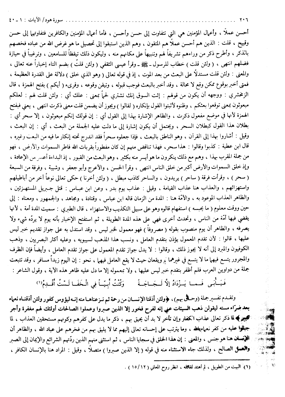 أحسن عملاً وأعمال المؤمنين هي التي تتفاوت إلى حسن وأحسن ، فأما أعمال المؤمنين والكافرين فتفاوتهما إلى حسن وقبيح ؟ ( قلت ) : الذين هم أحسن عملاً هم المتقون ، وهم الذين استبقوا إلى تحصيل ما هو غرض الله منن عباده ، فخصهم بالذكر ، واطرح ذكر من وراءهم تشريفاً لهم وتنبيهاً على مكانهم ، وليكون ذلك تيقظاً للسامعين وترغيباً في حيازة فضلهم انتهى . ولئن قلت ، خطاب للرسول ( صلى الله عليه وسلم ) ) . وقرأ عيسى الثقفي : ولئن قلت بضم التاء إخباراً عنه تعالى ، والمعنى : ولئن قلت مستدلاً على البعث من بعد الموت ، إذ في قوله تعالى : وهو الذي خلق ، دلالة على القدرة : العظيمة ، فمتى أخبر بوقوع ممكن وقع لا محالة ، وقد أخبر بالبعث فوجب قبوله وتيقن وقوعه . وقرىء : أيكم بفتح الهمزة . قال الزمخشري : ووجهه أن يكون من قولهم : ائت السوق إنك تشتري لحماً ، بمعنى علك أي : ولئن قلت لهم لعلكم مبعوثون بمعنى توقعوا بعثكم وظنوه ، لأثبتوا القول بإنكاره لقالوا : ويجوز أن يضمن . قلت معنى ذكرت انتهى يعني : فبفتح الهمزة لأنها في موضع مفعول ذكرت ، والظاهر الإشارة بهذا إلى القول أي : إن قولك إنكم مبعوثون إلا سحر أي بطلان هذا القول كبطلان السحر ، ويحتمل أن يكون إشارة إلى ما دلت عليه الجملة من البعث . أي : إن البعث . وقيل : أشاروا بهذا إلى القرآن ، وهو الناطق بالبعث ، فإذا جعلوه سحراً فقد اندرج تحته إنكار ما فيه من البعث وغيره . قال ابن عطية : كذبوا وقالوا : هذا سحر ، فهذا تناقض منهم إن كان مفطوراً بقربات الله فاطر السموات والأرض فهو من جملة المقرب بهذا ، وهم مع ذلك ينكرون ما هو أيسر منه بكثير وهو البعث من القبور ، إذ البداءة أعسر من الإعادة ، وإذ خلق السموات والأرض أكبر من خلق الناس انتهى . وقرأ الحسن ، والأعرج ، وأبو جعفر ، وشيبة ، وفرقة من السبعة : سحر . وقرأت فرقة : ساحر ، يريدون والساحر كاذب مبطل ، ولئن أخرنا حكى تعالى نوعاً آخر من أباطيلهم واستهزائهم ، والعذاب هنا عذاب القيامة . وقيل : عذاب يوم بدر . وعن ابن عباس : قتل جبريل المستهزئين ، والظاهر العذاب الموعود به ، والأمّة هنا المدة من الزمان قاله : ابن عباس ، وقتادة ، ومجاهد ، والجمهور ، ومعناه : إلى حين . ووقت معلوم ما يحبسه استفهام ، قالوه وهو على سبيل التكذيب والاستهزاء . قال الطبري : سميت المدة أمة ، لأنها يقضي فيها أمة من الناس وتحدث أخرى ، فهي على هذا المدة الطويلة ، ثم استفتح الأخبار بأنه يوم لا يردّه شيء ولا يصرفه . والظاهر أنّ يوم منصوب بقوله : مصروفاً ، فهو معمول لخبر ليس . وقد استدل به على جواز تقديم خبر ليس عليها قالوا : لأن تقدم المعمول يؤذن بتقدم العامل ، ونسب هذا المذهب لسيبويه ، وعليه أكثر البصريين . وذهب الكوفيون والمبرد : إلى أنه لا يجوز ذلك ، وقالوا : لا يدل جواز تقدم المعمول على جواز تقدم العامل . وأيضاً فإنّ الظرف المجرور يتسع فيهما ما لا يتسع في غيرهما ، ويقعان حيث لا يقع العامل فيهما نحو : إن اليوم زيداً مسافر ، وقد تتبعت جملة من دواوين العرب فلم أظفر بتقدم خبر ليس عليها ، ولا بمعموله ، إلا ما دل عليه ظاهر هذه الآية ، وقول الشاعر : فيأبى فما يزداد إلا لجاجه