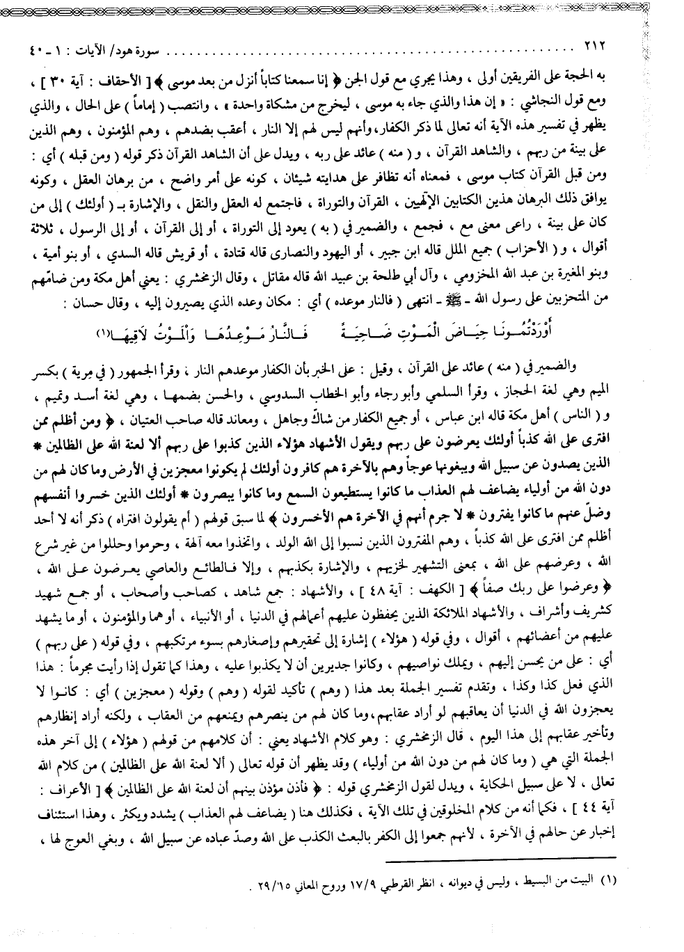 به الحجة على الفريقين أولى . وهذا يجري مع قول الجن : ) إِنَّا سَمِعْنَا كِتَاباً أُنزِلَ مِن بَعْدِ مُوسَى ( ومع قول النجاشي : إن هذا والذي جاء به موسى ليخرج من مشكاة واحدة . وانتصب إماماً على الحال ، والذي يظهر في تفسير هذه الآية أنه تعالى لما ذكر الكفار وأنهم ليس لهم إلا النار ، أعقب بضدهم وهم المؤمنون ، وهم الذين على بينة من ربهم ، والشاهد القرآن ، ومنه عائد على ربه . ويدل على أنّ الشاهد القرآن ذكر قوله : ومن قبله ، أي : ومن قبل القرآن كتاب موسى ، فمعناه : أنه تظافر على هدايته شيئان : كونه على أمر واضح من برهان العقل ، وكونه يوافق ذلك البرهان هذين الكتابين الإلهيين القرآن والتوراة ، فاجتمع له العقل والنقل . والإشارة بأولئك إلى من كان على بينة راعي معنى مع ، فجمع والضمير في به يعود إلى التوراة ، أو إلى القرآن ، أو إلى الرسول ، ثلاثة أقوال . والأحزاب جميع الملل قاله : ابن جبير ، أو اليهود ، والنصارى ، قاله قتادة . أو قريش قاله : السدي ، أو بنو أمية وبنو المغيرة بن عبد الله المخزومي ، وآل أبي طلحة بن عبيد الله ، قاله مقاتل . وقال الزمخشري : يعني أهل مكة ومن ضامّهم من المتحزبين على رسول الله ( صلى الله عليه وسلم ) ) انتهى . فالنار موعده أي : مكان وعده الذي يصيرون إليه . وقال حسان : أوردتمونا حياض الموت ضاحية