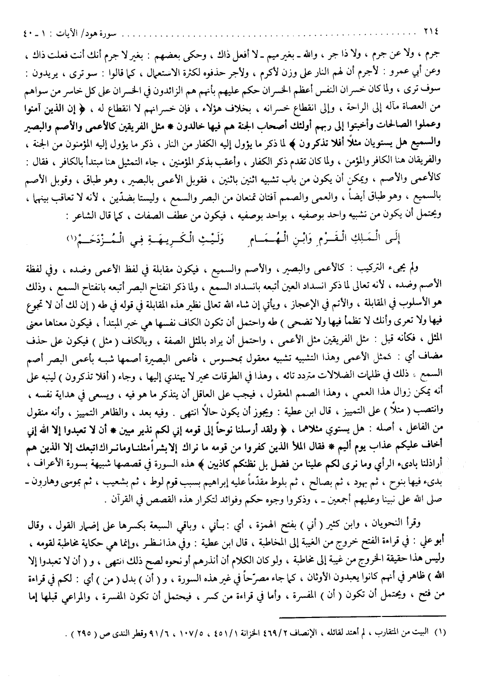 ( إِنَّ الَّذِينَ ءامَنُواْ وَعَمِلُواْ الصَّالِحَاتِ وَأَخْبَتُواْ إِلَى رَبّهِمْ أُوْلَائِكَ أَصْحَابُ الجَنَّةِ هُمْ فِيهَا خَالِدُونَ مَثَلُ الْفَرِيقَيْنِ كَالاْعْمَى وَالاْصَمِّ وَالْبَصِيرِ وَالسَّمِيعِ هَلْ يَسْتَوِيَانِ مَثَلاً أَفَلاَ تَذَكَّرُونَ ( : لما ذكر ما يؤول إليه الكفار من النار ، ذكر ما يؤول إليه المؤمنون من الجنة ، والفريقان هنا الكافر والمؤمن . ولما كان تقدم ذكر الكفار وأعقب بذكر المؤمنين ، جاء التمثيلم هنا مبتدأ بالكافر فقال : كالأعمى والأصم . ويمكن أن يكون من باب تشبيه اثنين باثنين ، فقوبل الأعمى بالبصير وهو طباق ، وقوبل الأصم بالسميع وهو طباق أيضاً ، والعمى والصمم آفتان تمنعان من البصر والسمع ، وليستا بضدّين ، لأنه لا تعاقب بينهما . ويحتمل أن يكون من تشبيه واحد بوصفيه بواحد بوصفيه ، فيكون من عطف الصفات كما قال الشاعر : إلى الملك القرن وابن الهمام