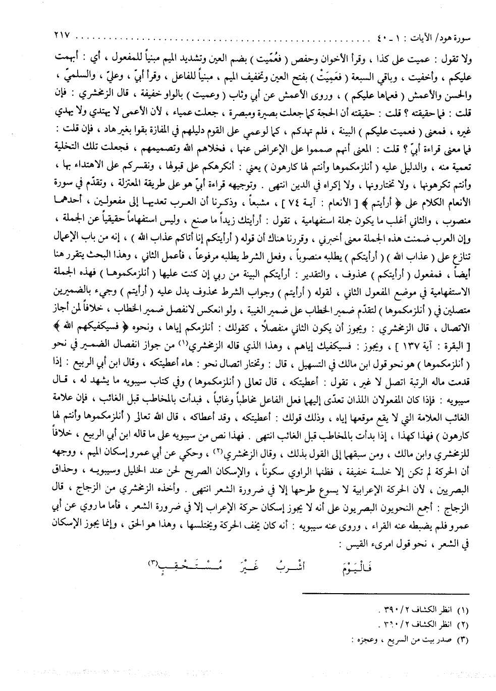 ولا تقول عميت على كذا ؟ وقرأ الإخوان وحفص : فعميت بضم العين وتشديد الميم مبنياً للمفعول ، أي أبهمت عليكم وأخفيت ، وباقي السبعة فعميت بفتح العين وتخفيف الميم مبنياً للفاعل . وقرأ أبيّ ، وعليّ ، والسلميّ ، والحسن ، والأعمش : فعماها عليكم . وروى الأعمش عن أبي وثاب : وعميت بالواو خفيفة . قال الزمخشري : ( فإن قلت ) : فما حقيقته ؟ ( قلت ) : حقيقته أنّ الحجة كما جعلت بصيرة ومبصرة جعلت عمياء ، لأنّ الأعمى لا يهتدي ، ولا يهدي غيره ، فمعنى فعميت عليكم البينة فلم تهدكم ، كما لو عمي على القوم دليلهم في المفازة بقوا بغير هاد . ( فإن قلت ) : فما معنى قراءة أبيّ ؟ ( قلت ) : المعنى أنهم صمموا على الإعراض عنها فخلاهم الله وتصميمهم ، فجعلت تلك التخلية تعمية منه ، والدليل عليه : أنلزمكموها وأنتم لها كارهون ؟ يعني : أنكرهكم على قبولها ونقسركم على الاهتداء بها وأنتم تكرهونها ولا تختارونها ، ولا إكراه في الدين انتهى . وتوجيهه قراءة أبيّ هو على طريقة المعتزلة ، وتقدّم في سورة الأنعام الكلام على ) أَرَءيْتُمْ ( مشبعاً ، وذكرنا أن العرب تعديها إلى مفعولين : أحدهما منصوب ، والثاني أغلب ما يكون جملة استفهامية . تقول : أرأيتك زيداً ما صنع ، وليس استفهاماً حقيقياً عن الجملة . وأنّ العرب ضمنت هذه الجملة معنى أخبرني ، وقررنا هناك أن قوله : ) أَرَأَيْتُكُم إِنْ أَتَاكُمْ عَذَابُ اللَّهِ ( أنه من باب الأعمال تنازع على عذاب الله . أرأيتكم يطلبه منصوباً ، وفعل الشرط يطلبه مرفوعاً ، فأعمل الثاني ، وهذا البحث يتقرر هنا أيضاً ، فمفعول أرأيتكم محذوف والتقدير : أرأيتكم البينة من ربي إن كنت عليها أنلزمكموها ؟ فهذه الجملة الاستفهامية في موضع المفعول الثاني لقوله : أرأيتم ، وجواب الشرط محذوف يدل عليه أرأيتم ، وجيء بالضميرين متصلين في أنلزمكموها ، لتقدّم ضمير الخطاب على ضمير الغيبة ، ولو انعكس لانفصل ضمير الخطاب خلافاً لمن أجاز الاتصال . قال الزمخشري : ويجوز أن يكون الثاني منفصلاً كقولك : أنلزمكم إياها ونحوه ، فسيكفيكهم الله ، ويجوز فسيكفيك إياهم ، وهذا الذي قاله الزمخشري من جواز انفصال الضمير في نحو أنلزمكموها ، هو نحو قول ابن مالك في التسهيل . قال : وتختار اتصال نحوها ءأعطيتكه . وقال ابن أبي الربيع : إذا قدمت ما له الرتبة اتصل لا غير ، تقول : أعطيتكه . قال تعالى : أنلزمكموها ؟ وفي كتاب سيبويه ما يشهد له ، قال سيبويه : فإذا كان المفعولان اللذان تعدّى إليهما فعل الفاعل مخاطباً وغائباً ، فبدأت بالمخاطب قبل الغائب ، فإنّ علامة الغائب العلامة التي لا يقع موقعها إياه وذلك قولك : أعطيتكه وقد أعطاكه . قال الله تعالى : أنلزمكموها وأنتم لها كارهون ، فهذا كهذا ، إذا بدأت بالمخاطب قبل الغائب انتهى . فهذا نص من سيبويه على ما قاله ابن أبي الربيع خلافاً للزمخشري وابن مالك ومن سبقهما إلى القول بذلك . وقال الزمخشري : وحكى عن أبي عمرو إسكان الميم ، ووجهه أنّ الحركة لم تكن إلا خلسة خفيفة ، فظنها الراوي سكوناً . والإسكان الصريح لحن عند الخليل وسيبويه وحذاق البصريين ، لأن الحركة الإعرابية لا يسوغ طرحها إلا في ضرورة الشعر انتهى . وأخذه الزمخشري من الزجاج ، قال الزجاج : أجمع النحويون البصريون على أنه لا يجوز إسكان حركة الإعراب إلا في ضرورة الشعر ، فأما ما روي عن أبي عمرو فلم يضبطه عنه القراء ، وروى عنه سيبويه أنه كان يخف الحركة ويختلسها ، وهذا هو الحق . وإنما يجوز الإسكان في الشعر نحو قول امرىء القيس :