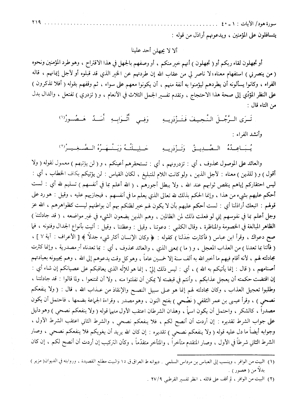 وقرأ ابن عباس : فأكثرت جدلنا كقوله : ) وَكَانَ الإِنْسَانُ أَكْثَرَ شَىء جَدَلاً ( فأتنا بما تعدنا من العذاب المعجل وما بمعنى الذي ، والعائد محذوف أي بما تعدناه ، أو مصدرية ، وإنما كثرت مجادته لهم لأنه أقام فيهم ما أخبر الله به ألف سنة إلا خمسين عاماً ، وهو كل وقت يدعوهم إلى الله وهم يجيبونه بعبادتهم أصنامهم . قال : إنما يأتيكم به الله ، أي ليس ذلك إليّ إنما هو للإله الذي يعاقبكم على عصيانكم إن شاء أي : إن اقتضت حكمته أن يعجل عذابكم وأنتم في قبضته لا يمكن أن تفلتوا منه ، ولا أن تمتنعوا . ولما قالوا : قد جادلتنا ، وطلبوا تعجيل العذاب ، وكان مجادلته لهم إنما هو على سبيل النصح والإنقاذ من عذاب الله قال : ولا ينفعكم نصحي .