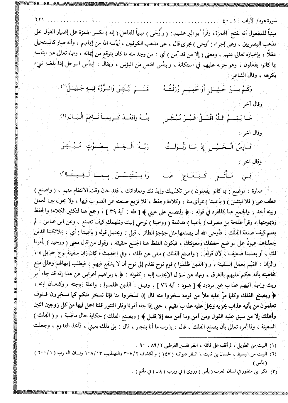 صارة موضع بما كانوا يفعلون من تكذيبك وإيذائك ومعاداتك ، فقد حان وقت الانتقام منهم . واصنع عطف على فلا تبتئس ، بأعيننا بمرأى منا ، وكلاءة وحفظ فلا تزيغ صنعته عن الصواب فيها ، ولا يحول بين العمل وبينه أحد . والجمع هنا كالمفرد في قوله : ولتصنع على عيني ، وجمعت هنا لتكثير الكلاءة والحفظ وديمومتها . وقرأ طلحة بن مصرف : باعينا مدغمة . ووحينا نوحي إليك ونلهمك كيف تصنع . وعن ابن عباس : لم يعلم كيف صنعة الفلك ، فأوحى الله أن يصنعها مثل جؤجؤ الطائر . قيل : ويحتمل قوله بأعيننا أي بملائكتنا الذي نجعلناهم عيوناً على مواضع حفظك ومعونتك ، فيكون اللفظ هنا للجمع حقيقة . وقول من قال : معنى ووحينا بأمرنا لك أو بعلمنا ضعيف ، لأن قوله : واصنع الفلك ، مغن عن ذلك . وفي الحديث : ( كان زان سفينة نوح جبريل ) والزان القيم بعمل السفينة . والذين ظلموا قوم نوح ، تقدم إلى نوح أن لا يشفع فيهم فيطلب إمهالهم ، وعلل منع مخاطبته بأنه حكم عليهم بالغرق ، ونهاه عن سؤال الإيجاب إليه كقوله : ) مُّنِيبٌ يإِبْراهِيمُ أَعْرِضْ عَنْ هَاذَا إِنَّهُ قَدْ جَاء أَمْرُ رَبّكَ وَإِنَّهُمْ اتِيهِمْ عَذَابٌ غَيْرُ مَرْدُودٍ ( وقيل الذين ظلموا واعلة زوجته وكنعان ابنه .