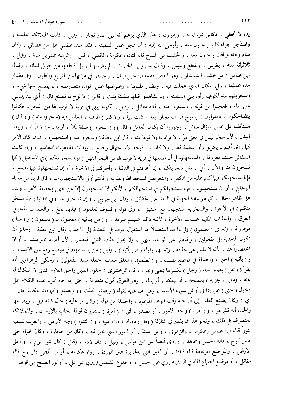 يده لا تخطىء ، فكانوا يمرون به ويقولون : هذا الذي يزعم أنه نبي صار نجاراً ؟ وقيل : كانت الملائكة تعلمه ، واستأجر أجراء كانوا ينحتون معه ، وأوحى الله إليه أن عجل عمل السفينة فقد اشتد غضبي على من عصاني ، وكان سام وحام ويافث ينحتون معه ، والخشب من الساج قاله : قتادة ، وعكرمة ، والكلبي . قيل : وغرسه عشرين سنة . وقيل : ثلاثمائة سنة يغرس ويقطع وييبس . وقال عمرو بن الحرث : لم يغرسها بل قطعها من جبل لبنان . وقال ابن عباس : من خشب الشمشار ، وهو البقص قطعة من جبل لبنان . واختلفوا في هيئتها من التربيع والطول ، وفي مقدار مدة عملها ، وفي المكان الذي عملت فيه ، ومقدار طولها وعرضها ، على أقوال متعارضة لم يصح منها شيء . وسخريتهم منه لكونهم رأوه يبني السفينة ولم يشاهدوا قبلها سفينة بنيت ، قالوا : يا نوح ما تصنع ؟ قال : ابني بيتاً يمشي على الماء ، فعجبوا من قوله وسخروا منه قاله : مقاتل . وقيل : لكونه يبني في قرية لا قرب لها من البحر ، فكانوا يتضاحكون ويقولون : يا نوح صرت نجاراً بعدما كنت نبياً . وكلما ظرف العامل فيه سخروا منه ، وقال : مستأنف على تقدير سؤال سائل . وجوزوا أن يكون العامل قال : وسخروا صفة لملا ، أو بدل من مرّ ، ويبعد البدل لأنّ سخر ليس في معنى مرّ لا يراد ذا ولا نوعاً منه . قال ابن عطية : وسخروا منه استجهلوه ، فإن كان الأمر كما روي أنهم لم يكونوا رأوا سفينة قط ، ولا كانت ، فوجه الاستجهال واضح ، وبذلك تظاهرت التفاسير ، وإن كانت السفائن جينئذ معروفة فاستجهلوه في أنّ صنعها في قرية لا قرب لها من البحر انتهى ، فأنا نسخر منكم في المتقبل كما تسخرون منا الآن أي : مثل سخريتكم إذا أغرقتم في الدنيا ، وأحرقتم في الآخرة ، أو إن تستجهلونا فيما نصنع فإنا نستجهلكم فيما أنتم عليه من الكفر والتعريض لسخط الله وعذابه ، فأنتم أولى بالاستجهال منا قال : قريباً من معناه الزجاج . أو إن تستجهلونا فإنا نستجهلكم في استجهالكم ، لأنكم لا تستجهلون إلا عن جهل بحقيقة الأمر ، وبناء على ظاهر الحال ، كما هو عادة الجهلة في البعد عن الحقائق . وقال ابن جريج : إن يسخروا منا في الدنيا فإنا نسخر منكم في الآخرة . والسخرية استجهال مع استهزاء . وفي قوله : فسوف تعلمون ، تهديد بالغ ، والعذاب المخزي الغرق ، والعذاب المقيم عذاب الآخرة ، لأنه دائم عليهم سرمد . ومن يأتيه مفعول بتعلمون ، وما موصولة ، وتعدى تعلمون إلى واحد استعمالاً لها استعمال عرف في التعدية إلى واحد . وقال ابن عطية : وجائز أن تكون التعدية إلى مفعولين ، واقتصر على الواحد انتهى . ولا يجوز حذف الثاني اقتصاراً ، لأنّ أصله خبر مبتدأ ، ولا اختصاراً هنا ، لأنه لا دليل على حذفه وتعنتهم بقوله : من يأتيه . وقيل : مَن استفهام في موضع رفع على الابتداء ، ويأتيه الخبر ، والجملة في موضع نصب ، وتعلمون معلق سدت الجملة مسد المفعولين . وحكى الزهراوي أنه يقرأ ويحل بضم الحاء ، ويحل بكسرها بمعنى ويجب . قال الزمخشري : حلول الدين والحق اللازم الذي لا انفكاك له عنه ، ومعنى يخزيه : يفضحه ، أو يهلكه ، أو يذله ، وهو الغرق . أقوال متقاربة حتى إذا جاء أمرنا تقدم الكلام على دخول حتى على إذا في أوائل سورة الأنعام ، وهي هنا غاية لقوله : ويصنع الفلك . ويصنع كما قلنا حكاية حال أي : وكان يصنع الفلك إلى أن جاء وقت الوعد الموعود . والجملة من قوله : وكلما مرّ عليه حال ، كأنه قيل : وينصعها ، والحال أنه كلما مر ، وأمرنا واحد الأمور ، أو مصدر أي : أمرنا بالفوران أو للسحاب بالإرسال ، وللملائكة بالتصرف في ذلك ، ونحو هذا مما يقدر في النازلة . وفار : معناه انبعث بقوة ، والتنور وجه الأرض ، والعرب تسميه تنوراً قاله : ابن عباس ، وعكرمة ، والزهري ، وابن عيينة ، أو التنور الذي يخبز فيه ، وكان من حجارة ، وكان لحواء حتى صار لنوح قاله : الحسن ، ومجاهد ، وروي أيضاً عن ابن عباس . وقيل : كان لآدم ، وقيل : كان تنور ، نوح ، أو أعلى الأرض والمواضع المرتفعة قاله : قتادة ، أو العين التي بالجزيرة عين الوردة رواه عكرمة ، أو من أقصى دار نوح قاله : مقاتل ، أو موضع اجتماع الماء في الس