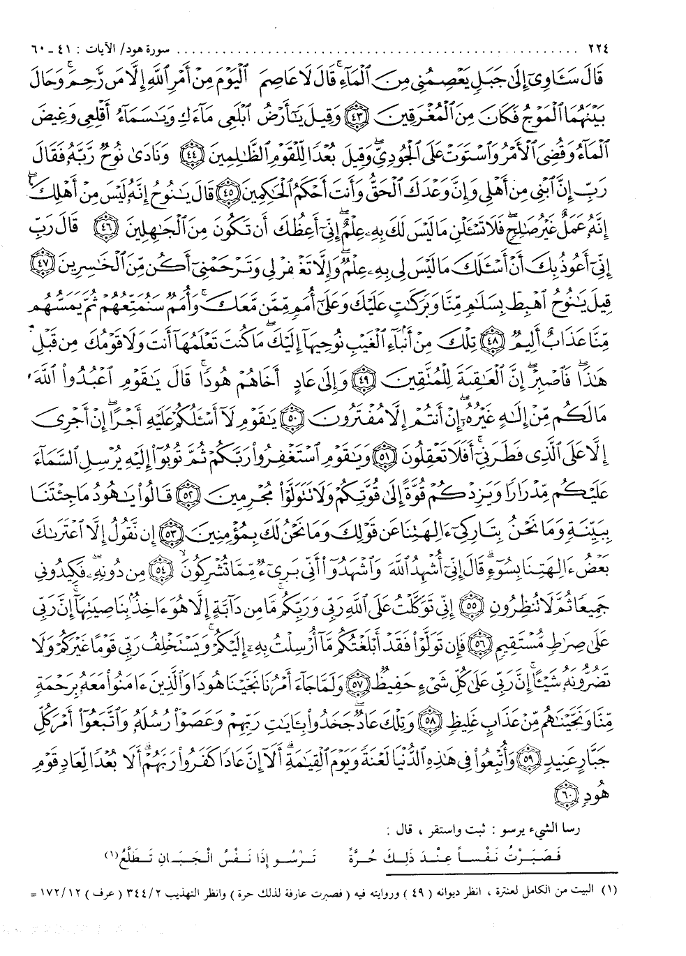 قَالَ سَآوِى إِلَى جَبَلٍ يَعْصِمُنِى مِنَ الْمَآءِ قَالَ لاَ عَاصِمَ الْيَوْمَ مِنْ أَمْرِ اللَّهِ إِلاَّ مَن رَّحِمَ وَحَالَ بَيْنَهُمَا الْمَوْجُ فَكَانَ مِنَ الْمُغْرَقِينَ وَقِيلَ ياأَرْضُ ابْلَعِى مَآءَكِ وَياسَمَآءُ أَقْلِعِى وَغِيضَ الْمَآءُ وَقُضِىَ الاٌّ مْرُ وَاسْتَوَتْ عَلَى الْجُودِىِّ وَقِيلَ بُعْدًا لِّلْقَوْمِ الظَّالِمِينَ وَنَادَى نُوحٌ رَّبَّهُ فَقَالَ رَبِّ إِنَّ ابُنِى مِنْ أَهْلِى وَإِنَّ وَعْدَكَ الْحَقُّ وَأَنتَ أَحْكَمُ الْحَاكِمِينَ قَالَ يانُوحُ إِنَّهُ لَيْسَ مِنْ أَهْلِكَ إِنَّهُ عَمَلٌ غَيْرُ صَالِحٍ فَلاَ تَسْأَلْنِى مَا لَيْسَ لَكَ بِهِ عِلْمٌ إِنِّىأَعِظُكَ أَن تَكُونَ مِنَ الْجَاهِلِينَ قَالَ رَبِّ إِنِّىأَعُوذُ بِكَ أَنْ أَسْأَلَكَ مَا لَيْسَ لِى بِهِ عِلْمٌ وَإِلاَّ تَغْفِرْ لِى وَتَرْحَمْنِىأَكُن مِّنَ الْخَاسِرِينَ قِيلَ يانُوحُ اهْبِطْ بِسَلَامٍ مِّنَّا وَبَركَاتٍ عَلَيْكَ وَعَلَى أُمَمٍ مِّمَّن مَّعَكَ وَأُمَمٌ سَنُمَتِّعُهُمْ ثُمَّ يَمَسُّهُمْ مِّنَّا عَذَابٌ أَلِيمٌ تِلْكَ مِنْ أَنْبَآءِ الْغَيْبِ نُوحِيهَآ إِلَيْكَ مَا كُنتَ تَعْلَمُهَآ أَنتَ وَلاَ قَوْمُكَ مِن قَبْلِ هَاذَا فَاصْبِرْ إِنَّ الْعَاقِبَةَ لِلْمُتَّقِينَ وَإِلَى عَادٍ أَخَاهُمْ هُودًا قَالَ ياقَوْمِ اعْبُدُواْ اللَّهَ مَا لَكُمْ مِّنْ إِلَاهٍ غَيْرُهُ إِنْ أَنتُمْ إِلاَّ مُفْتَرُونَ ياقَوْمِ لاأَسْأَلُكُمْ عَلَيْهِ أَجْرًا إِنْ أَجْرِىَ إِلاَّ عَلَى الَّذِى فَطَرَنِىأَفَلاَ تَعْقِلُونَ وَياقَوْمِ اسْتَغْفِرُواْ رَبَّكُمْ ثُمَّ تُوبُواْ إِلَيْهِ يُرْسِلِ السَّمَآءَ عَلَيْكُمْ مِّدْرَاراً وَيَزِدْكُمْ قُوَّةً إِلَى قُوَّتِكُمْ وَلاَ تَتَوَلَّوْاْ مُجْرِمِينَ قَالُواْ ياهُودُ مَا جِئْتَنَا بِبَيِّنَةٍ وَمَا نَحْنُ بِتَارِكِىءالِهَتِنَا عَن قَوْلِكَ وَمَا نَحْنُ لَكَ بِمُؤْمِنِينَ إِن نَّقُولُ إِلاَّ اعْتَرَاكَ بَعْضُ ءَالِهَتِنَا بِسُوءٍ قَالَ إِنِّىأُشْهِدُ اللَّهِ وَاشْهَدُواْ أَنِّى بَرِىءٌ مِّمَّا تُشْرِكُونَ مِن دُونِهِ فَكِيدُونِى جَمِيعًا ثُمَّ لاَ تُنظِرُونِ إِنِّى تَوَكَّلْتُ عَلَى اللَّهِ رَبِّى وَرَبِّكُمْ مَّا مِن دَآبَّةٍ إِلاَّ هُوَ ءاخِذٌ بِنَاصِيَتِهَآ إِنَّ رَبِّى عَلَى صِرَاطٍ مُّسْتَقِيمٍ فَإِن تَوَلَّوْاْ فَقَدْ أَبْلَغْتُكُمْ مَّآ أُرْسِلْتُ بِهِ إِلَيْكُمْ وَيَسْتَخْلِفُ رَبِّى قَوْمًا غَيْرَكُمْ وَلاَ تَضُرُّونَهُ شَيْئًا إِنَّ رَبِّى عَلَى كُلِّ شَىْءٍ حَفِيظٌ وَلَمَّا جَآءَ أَمْرُنَا نَجَّيْنَا هُودًا وَالَّذِينَ ءَامَنُواْ مَعَهُ بِرَحْمَةٍ مِّنَّا وَنَجَّيْنَاهُمْ مِّنْ عَذَابٍ غَلِيظٍ وَتِلْكَ عَادٌ جَحَدُواْ بِآيَاتِ رَبِّهِمْ وَعَصَوْاْ رُسُلَهُ وَاتَّبَعُواْ أَمْرَ كُلِّ جَبَّارٍ عَنِيدٍ وَأُتْبِعُواْ فِى هَاذِهِ الدُّنْيَا لَعْنَةً وَيَوْمَ الْقِيَامَةِ أَلاإِنَّ عَادًا كَفَرُواْ رَبَّهُمْ أَلاَ بُعْدًا لِّعَادٍ قَوْمِ هُودٍ } )