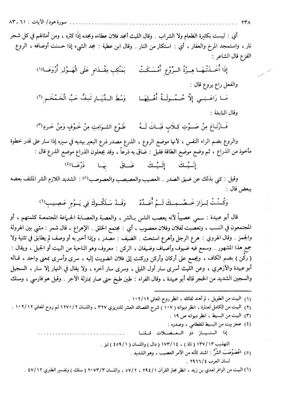 قال أبو عبيدة : سمى عصيباً لأنه يعصب الناس بالشر ، والعصبة والعصابة الجماعة المجتمعة كلمتهم ، أو المجتمعون في النسب . وتعصبت لفلان وفلان معصوب أي : مجتمع الخلق . الإهراغ : قال شمر مشي بين الهرولة والجمز . وقال الهروي : هرع الرجل وأهرع استحث . الضيف : مصدر ، وإذا أخبر به أو وصف لم يطابق في تثنية ولا جمع ، هذا المشهور . وسمع فيه ضيوف وأضياف وضيفان . الركن : معروف وهو الناحية من البيت ، أو الجبل . ويقال : ركن بضم الكاف ، ويجمع على أركان وأركن . وركنت إلى فلان انضويت إليه . سرى وأسرى بمعنى واحد قاله أبو عبيدة والأهري ، وعن الليث أسرى سار أو الليل ، وسرى سار آخره ، ولا يقال في النهار إلا سار . السجيل والسجين الشديد من الخجر قاله أبو عبيدة . وقال الفراء : طين طبخ حتى صار بمنزلة الآجر . وقيل : هو فارسي ، وسنك