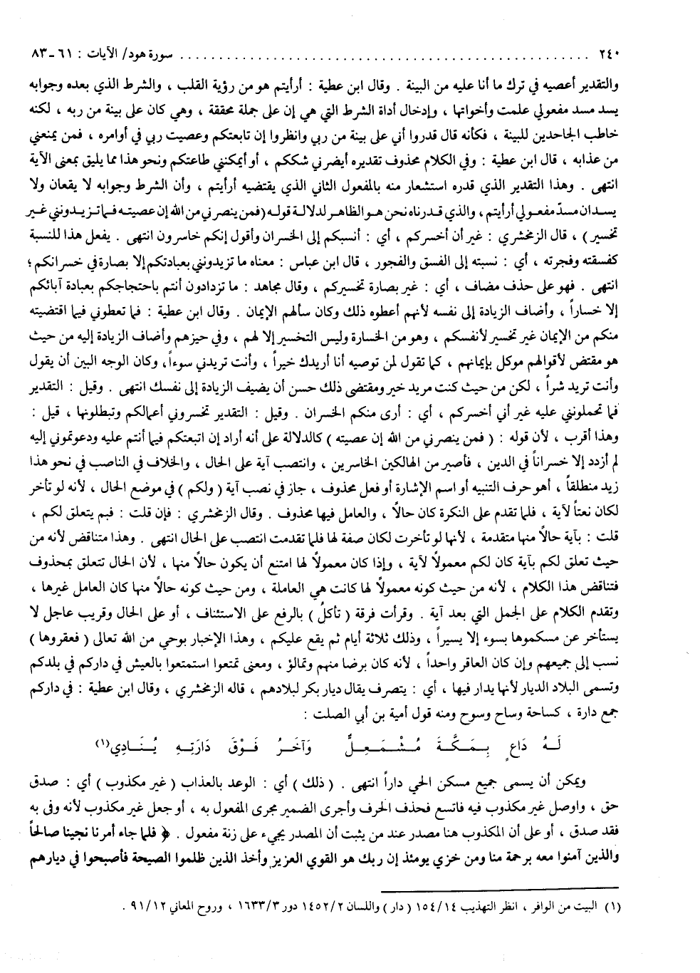 والتقدير : أعصيه في ترك ما أنا عليه من البينة . وقال ابن عطية : أرأيتم هو من رؤية القلب ، والشرط الذي بعده وجوابه يسد مسد مفعولي علمت وأخواتها ، وإدخال أداة الشرط التي هي إن على جملة محققة ، وهي كان على بينة من ربه ، لكنه خاطب الجاحدين للبينة فكأنه قال : قدروا أني على بينة من ربي وانظروا إنْ تابعتكم وعصيت ربي في أو أمره ، فمن يمنعني من عذابه ؟ قال ابن عطية : وفي الكلام محذوف تقديره : أيضرني شككم ، أو أيمكنني طاعتكم ، ونحو هذا مما يليق بمعنى الآية انتهى . وهذا التقدير الذي قدره استشعار منه بالمفعول الثاني الذي يقتضيه أرأيتم ، وأن الشرط وجوابه لا يقعان ولا يسدان مسد مفعولي أرأيتم ، والذي قدرناه نحن هو الظاهر لدلالة قوله : فمن ينصرني من الله إن عصيته ، فما تزيدونني غير تخسير . قال الزمخشري : غير أن أخسركم أي أنسبكم إلى الخسران ، وأقول أنكم خاسرون انتهى . يفعل هذا للنسبة كفسقته وفجرته أي : نسبته أي الفق والفجور . قال ابن عباس : معناه ما تزيدونني بعبادتكم إلا بصارة في خسرانكم انتهى . فهو على حذف مضاف أي : غير بصاوة تخسيركم . وقال مجاهد : ما تزدادون أنتم باحتجاجكم بعبادة آبائكم إلا خساراً ، وأضاف الزيادة إلى نفسه لأنهم أعطوه ذلك وكان سألهم الإيمان . وقال ابن عطية : فما تعطوني فيما اقتضيته منكم من الإيمان غير تخسير لأنفسكم ، وهو من الخسارة وليس التخسير إلا لهم ، وفي حيزهم ، وأضاف الزيادة إليه من حيث هو مقتض لأقوالهم موكل بإيمانهم كما تقول لمن توصيه : أنا أريدك خيراً وأنت تريدني سوأ ، وكان الوجه البين أن يقول : وأنت تريد شراً ، لكن من حيث كنت مريد خير ، ومقتضى ذلك حسن أن يضيف الزيادة إلى نفسك انتهى . وقيل : التقدير فما تحملونني عليه ، غير أني أخسركم أي : أرى منكم الخسران . وقيل : التقدير تخسروني أعمالكم وتبطلونها . قيل وهذا أقرب ، لأن قوله : فمن ينصرني من الله إن عصيته كالدلالة على أنه أراد إن اتبعتكم فيما أنتم عليه ودعوتموني إليه لم أزدد إلا خسراناً في الدين ، فأصبر من الهالكين الخاسرين . وانتصب آية على الحال ، والخلاف في الناصب في نحو هذا زيد منطلقاً ، أهو حرف التنبيه ؟ أو اسم الإشارة ؟ أو فعل محذوف ؟ جاز في نصب آية ولكم في موضع الحال ، لأنه لو تأخر لكان نعتاً لآية ، فلما تقدم على النكرة كان حالاً ، والعامل فيها محذوف .